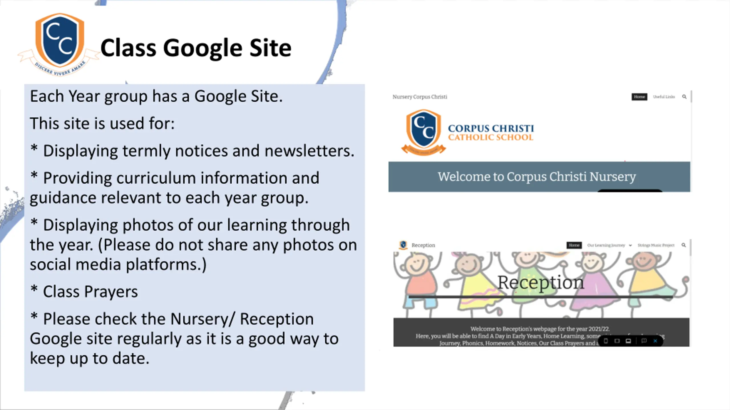 Class Google Site Each Year group has a Google Site. This site is used for: * Displaying termly notices and newsletters. * Providing curriculum information and guidance relevant to each year group. * Displaying photos of our learning through the year. (Please do not share any photos on social media platforms.) * Class Prayers * Please check the Nursery/ Reception Google site regularly as it is a good way to keep up to date.