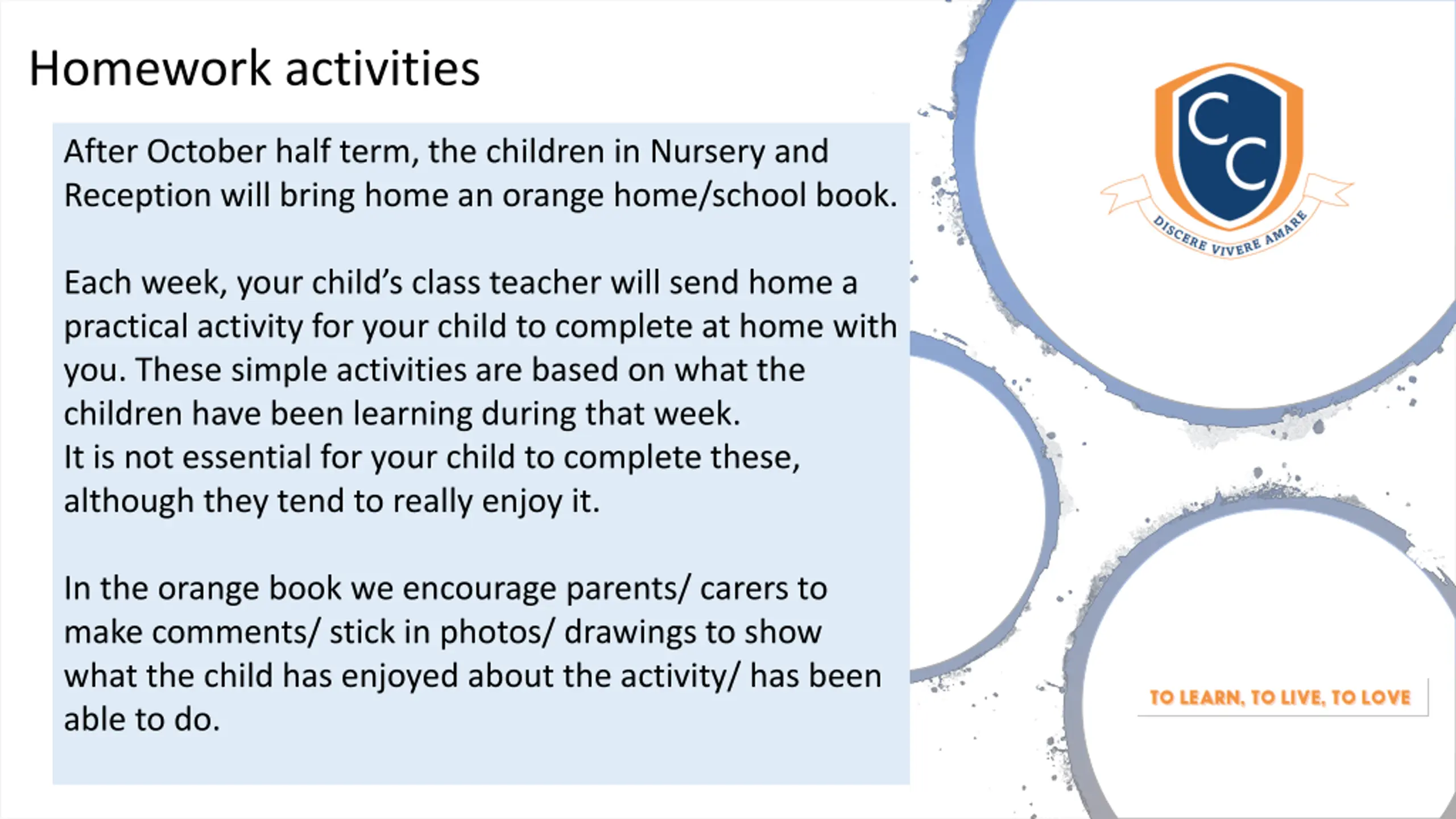 Homework activities After October half term, the children in Nursery and Reception will bring home an orange home/school book. Each week, your child s class teacher will send home a practical activity for your child to complete at home with you. These simple activities are based on what the children have been learning during that week. It is not essential for your child to complete these, although they tend to really enjoy it. In the orange book we encourage parents/ carers to make comments/ stick in photos/ drawings to show what the child has enjoyed about the activity/ has been able to do.