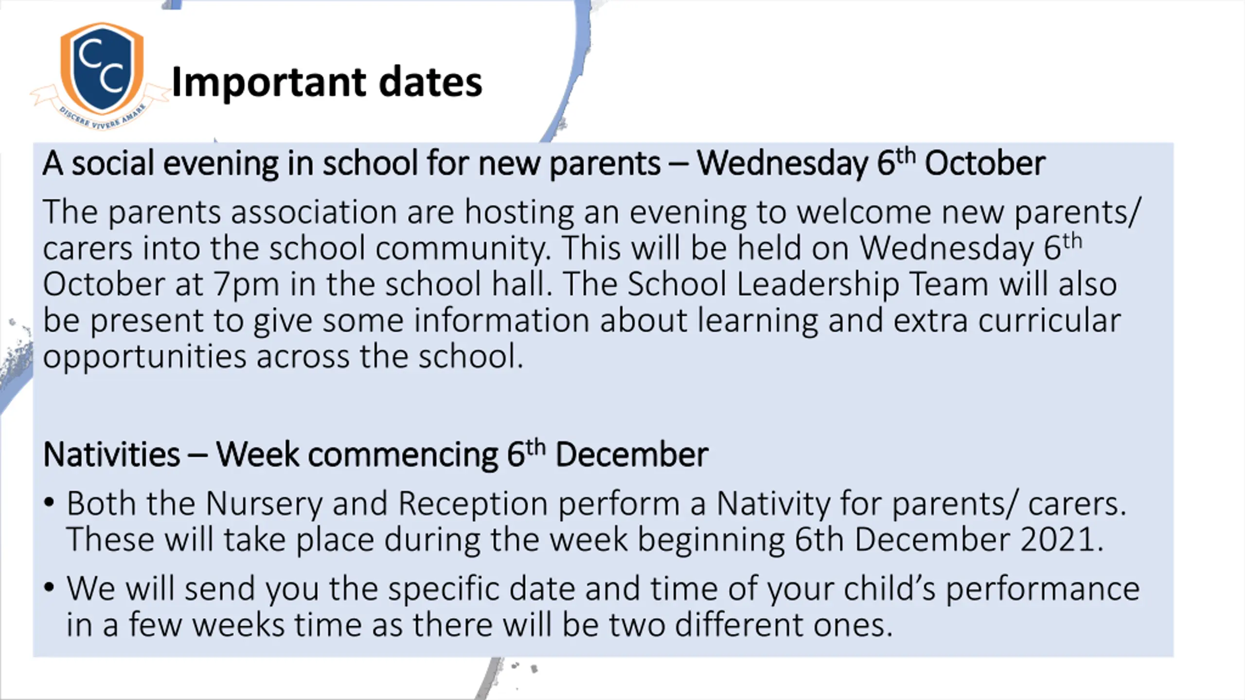 Important dates A social evening in school for new parents A social evening in school for new parents Wednesday 6 The parents association are hosting an evening to welcome new parents/ carers into the school community. This will be held on Wednesday 6th October at 7pm in the school hall. The School Leadership Team will also be present to give some information about learning and extra curricular opportunities across the school. Wednesday 6th th October October Nativities Nativities Week commencing 6 Week commencing 6th th December Both the Nursery and Reception perform a Nativity for parents/ carers. These will take place during the week beginning 6th December 2021. We will send you the specific date and time of your child s performance in a few weeks time as there will be two different ones. December