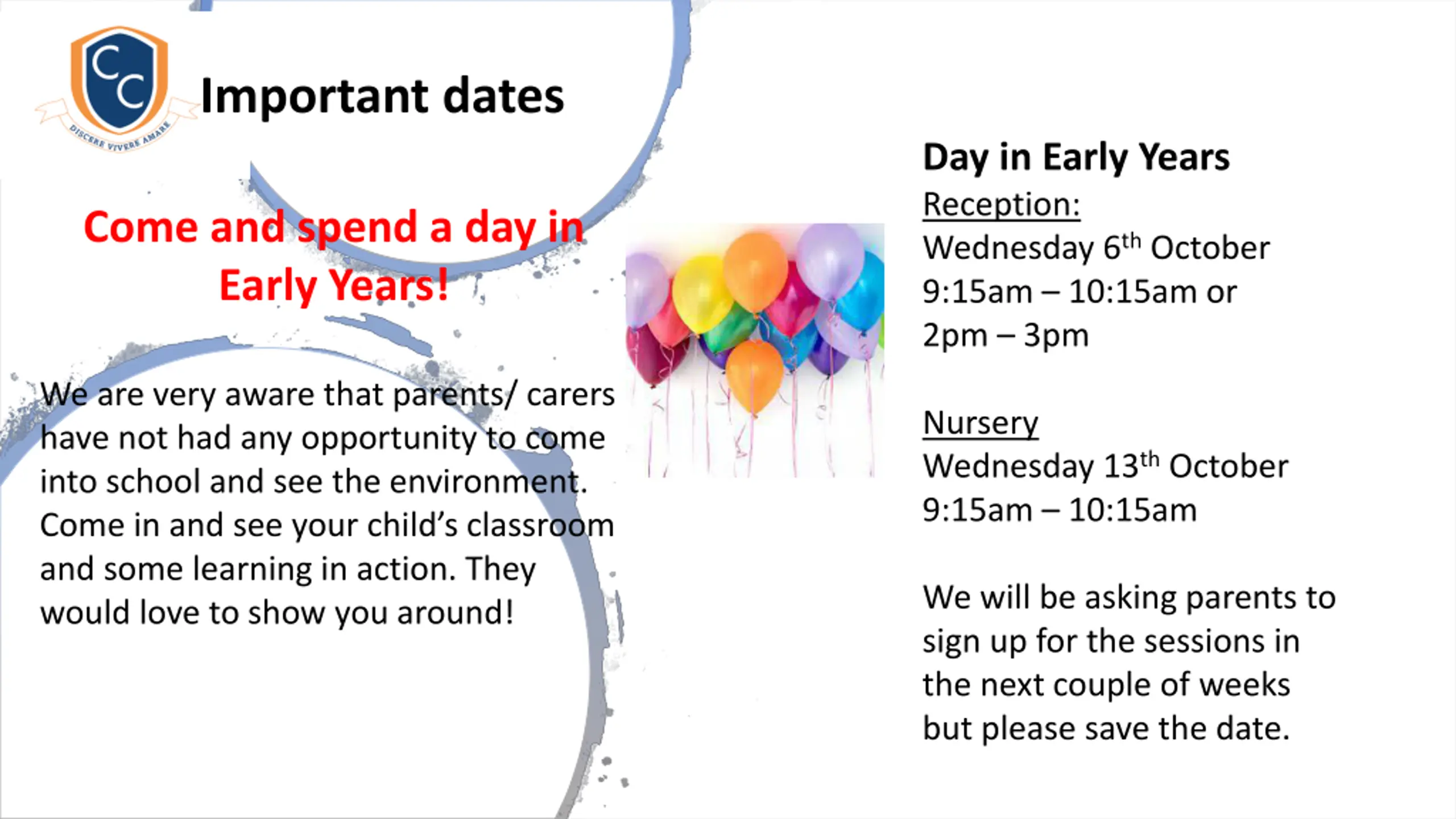Important dates Come and spend a day in Early Years! Day in Early Years Reception: Wednesday 6th October 9:15am 10:15am or 2pm 3pm We are very aware that parents/ carers have not had any opportunity to come into school and see the environment. Come in and see your child s classroom and some learning in action. They would love to show you around! Nursery Wednesday 13th October 9:15am 10:15am We will be asking parents to sign up for the sessions in the next couple of weeks but please save the date.