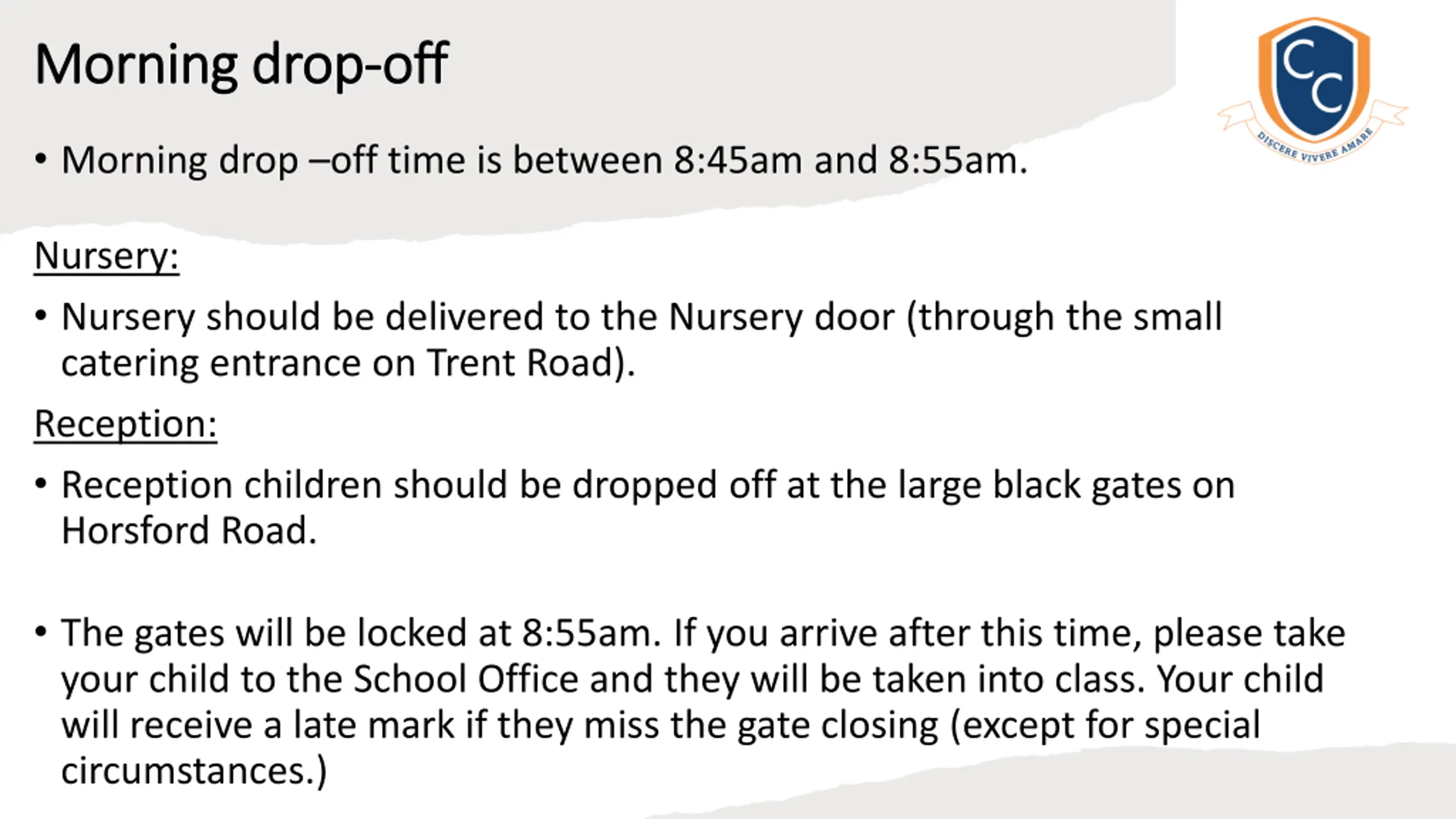 Morning drop Morning drop- -off off Morning drop off time is between 8:45am and 8:55am. Nursery: Nursery should be delivered to the Nursery door (through the small catering entrance on Trent Road). Reception: Reception children should be dropped off at the large black gates on Horsford Road. The gates will be locked at 8:55am. If you arrive after this time, please take your child to the School Office and they will be taken into class. Your child will receive a late mark if they miss the gate closing (except for special circumstances.)