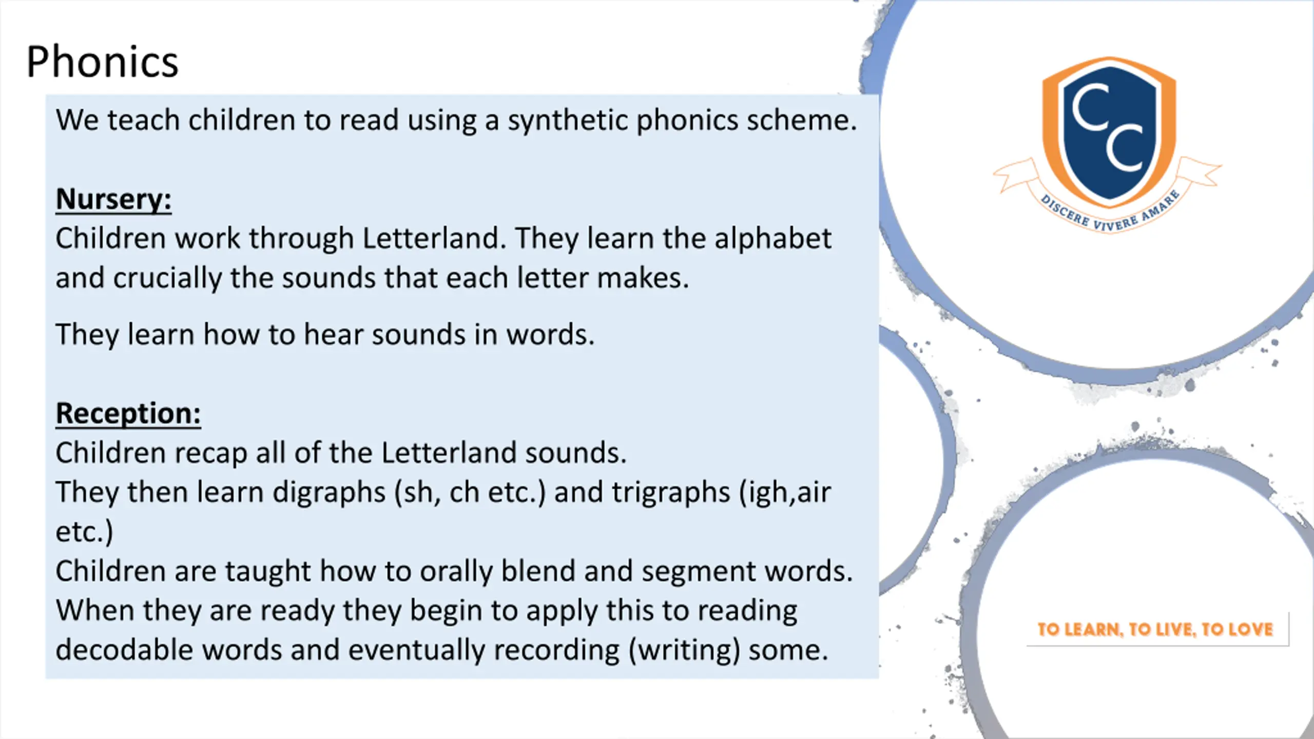 Phonics We teach children to read using a synthetic phonics scheme. Nursery: Children work through Letterland. They learn the alphabet and crucially the sounds that each letter makes. They learn how to hear sounds in words. Reception: Children recap all of the Letterland sounds. They then learn digraphs (sh, ch etc.) and trigraphs (igh,air etc.) Children are taught how to orally blend and segment words. When they are ready they begin to apply this to reading decodable words and eventually recording (writing) some.