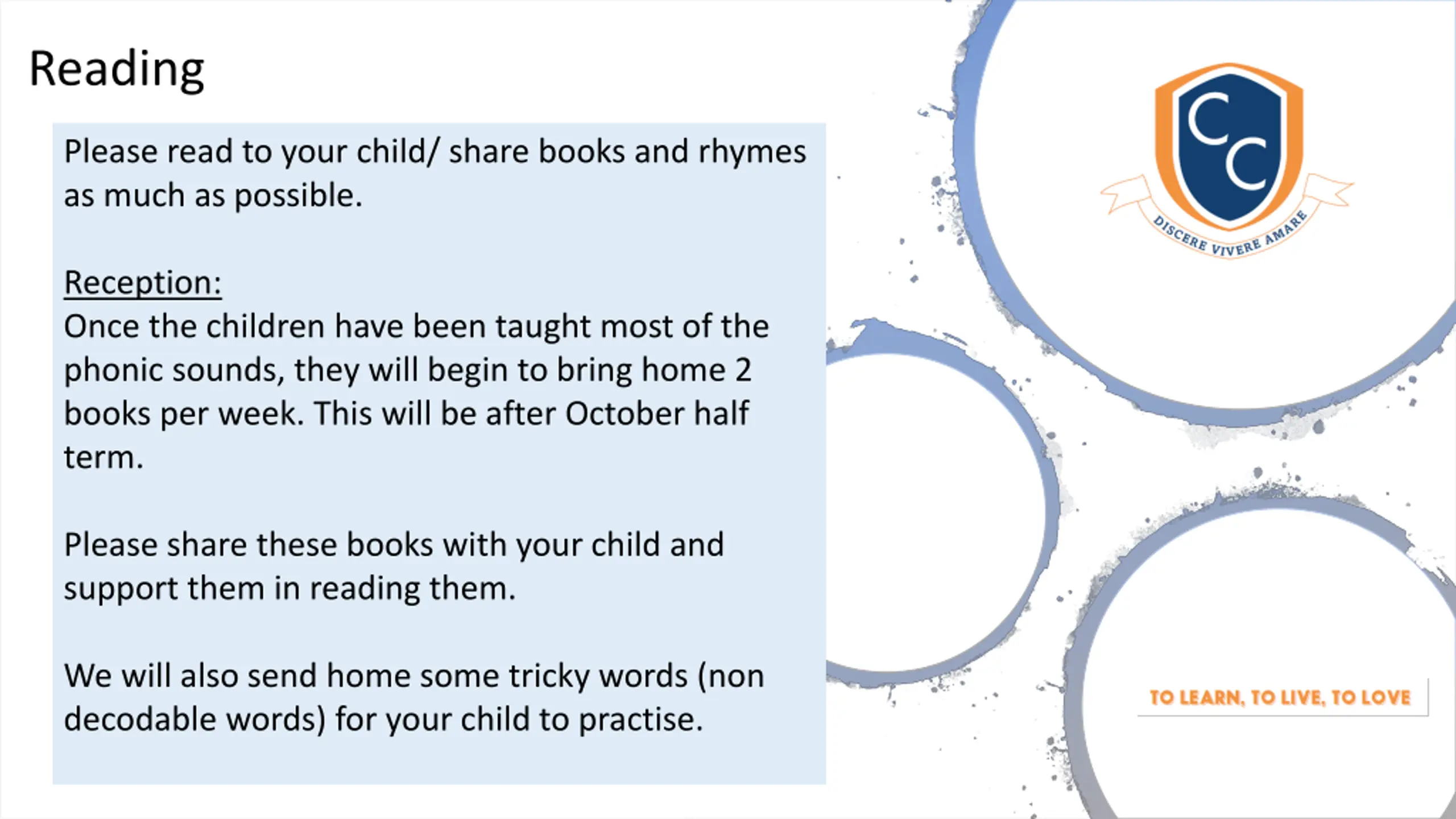Reading Please read to your child/ share books and rhymes as much as possible. Reception: Once the children have been taught most of the phonic sounds, they will begin to bring home 2 books per week. This will be after October half term. Please share these books with your child and support them in reading them. We will also send home some tricky words (non decodable words) for your child to practise.