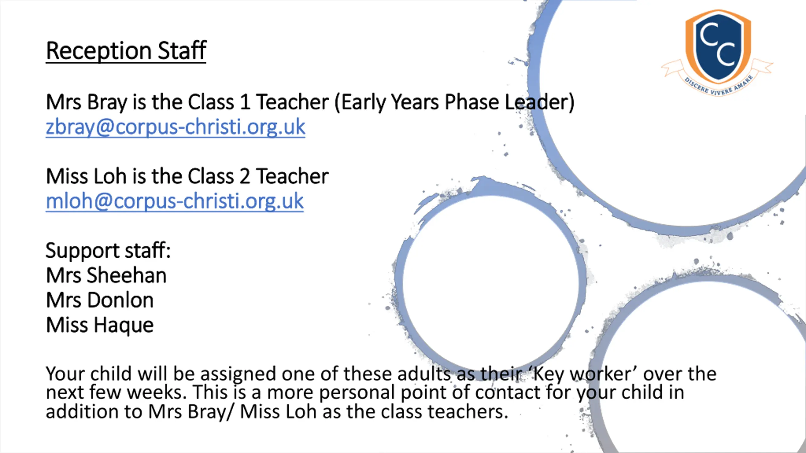 Reception Staff Reception Staff Mrs Bray is the Class 1 Teacher ( Mrs Bray is the Class 1 Teacher (Early Years Phase Leader) zbray@corpus zbray@corpus- -christi.org.uk christi.org.uk Early Years Phase Leader) Miss Miss Loh mloh@corpus mloh@corpus- -christi.org.uk Loh is the Class 2 Teacher is the Class 2 Teacher christi.org.uk Support staff: Support staff: Mrs Sheehan Mrs Sheehan Mrs Mrs Donlon Donlon Miss Miss Haque Haque Your child will be assigned one of these adults as their Key worker over the next few weeks. This is a more personal point of contact for your child in addition to Mrs Bray/ Miss Loh as the class teachers.