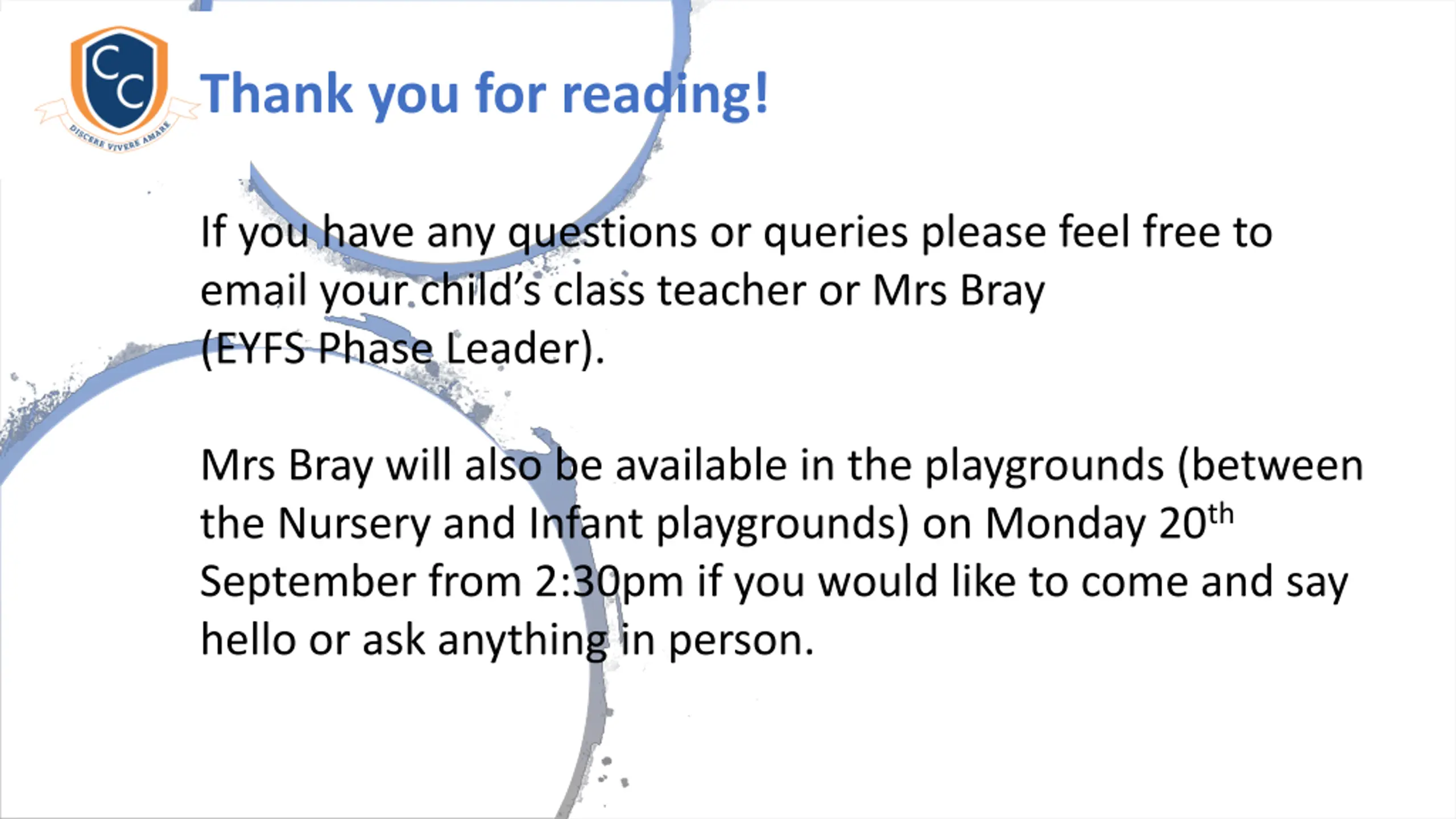 Thank you for reading! If you have any questions or queries please feel free to email your child s class teacher or Mrs Bray (EYFS Phase Leader). Mrs Bray will also be available in the playgrounds (between the Nursery and Infant playgrounds) on Monday 20th September from 2:30pm if you would like to come and say hello or ask anything in person.