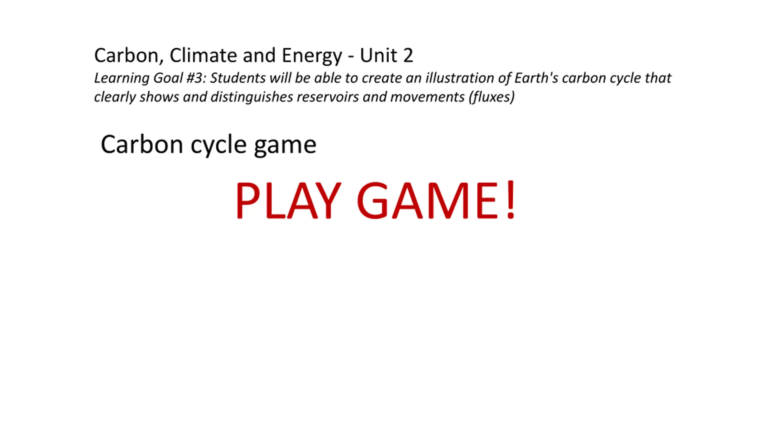 Carbon, Climate and Energy - Unit 2 Learning Goal #3: Students will be able to create an illustration of Earth's carbon cycle that clearly shows and distinguishes reservoirs and movements (fluxes) Carbon cycle game PLAY GAME!