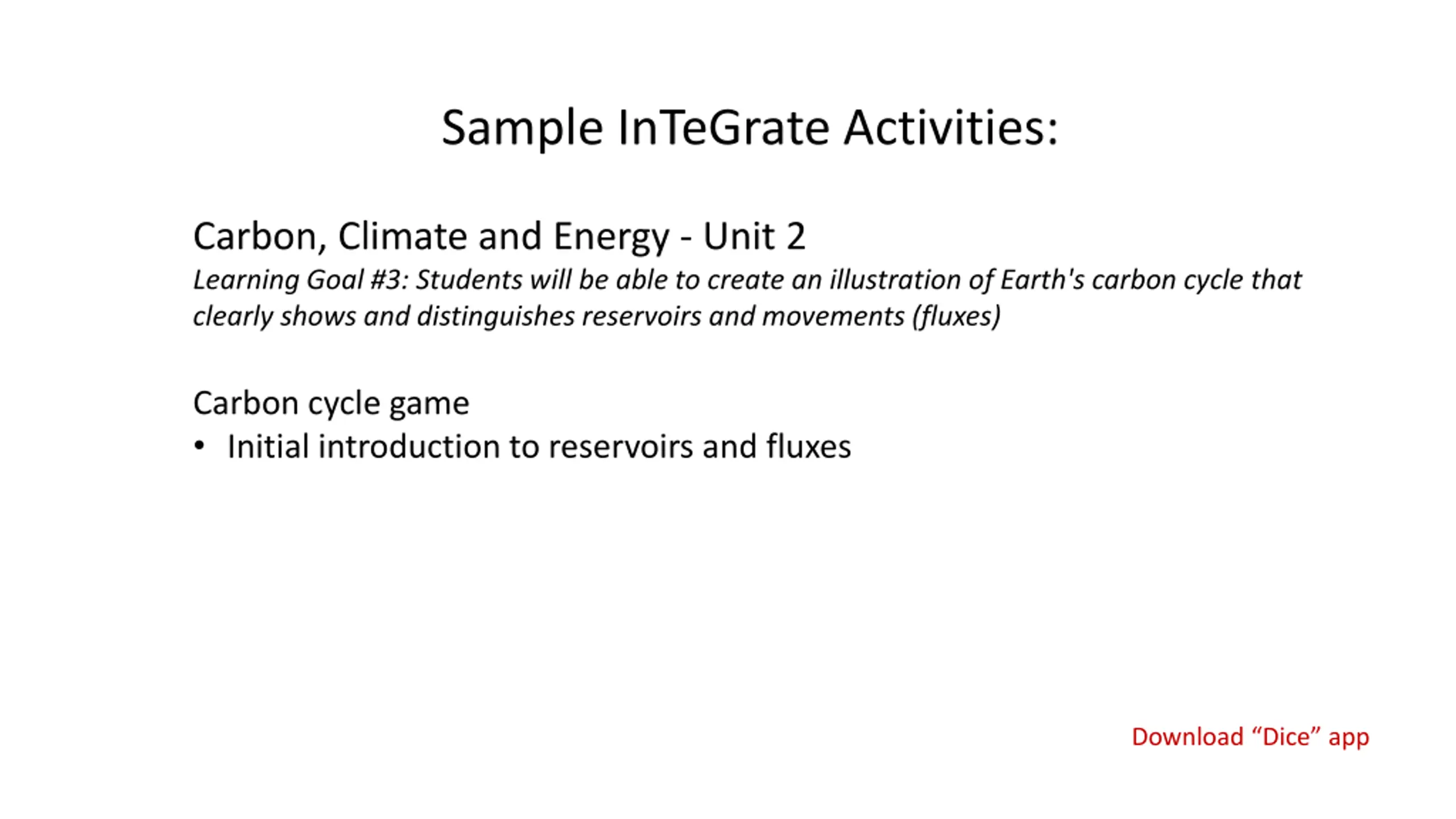 Sample InTeGrate Activities: Carbon, Climate and Energy - Unit 2 Learning Goal #3: Students will be able to create an illustration of Earth's carbon cycle that clearly shows and distinguishes reservoirs and movements (fluxes) Carbon cycle game Initial introduction to reservoirs and fluxes Download Dice app