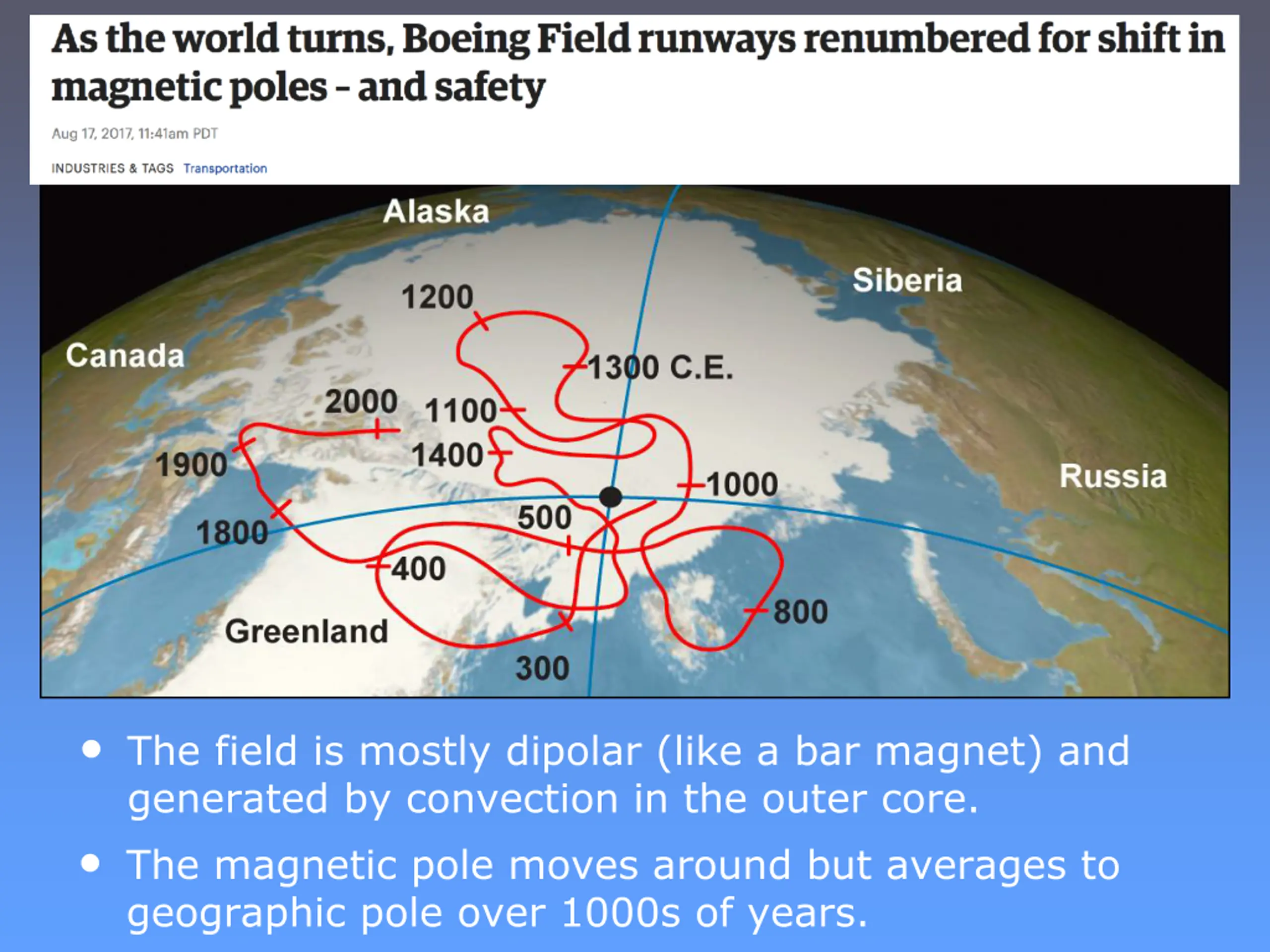 Image The Earth s magnetic field The field is mostly dipolar (like a bar magnet) and generated by convection in the outer core. The magnetic pole moves around but averages to geographic pole over 1000s of years.