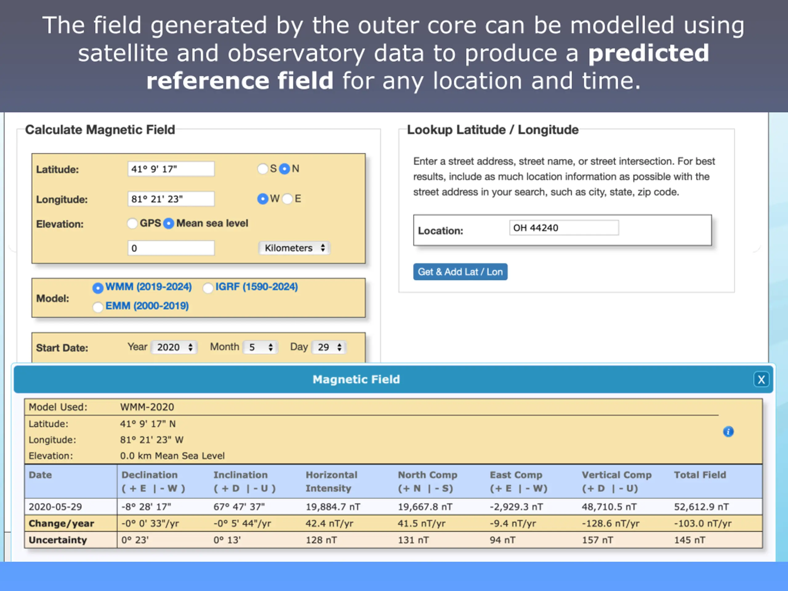 The field generated by the outer core can be modelled using satellite and observatory data to produce a predicted reference field for any location and time.