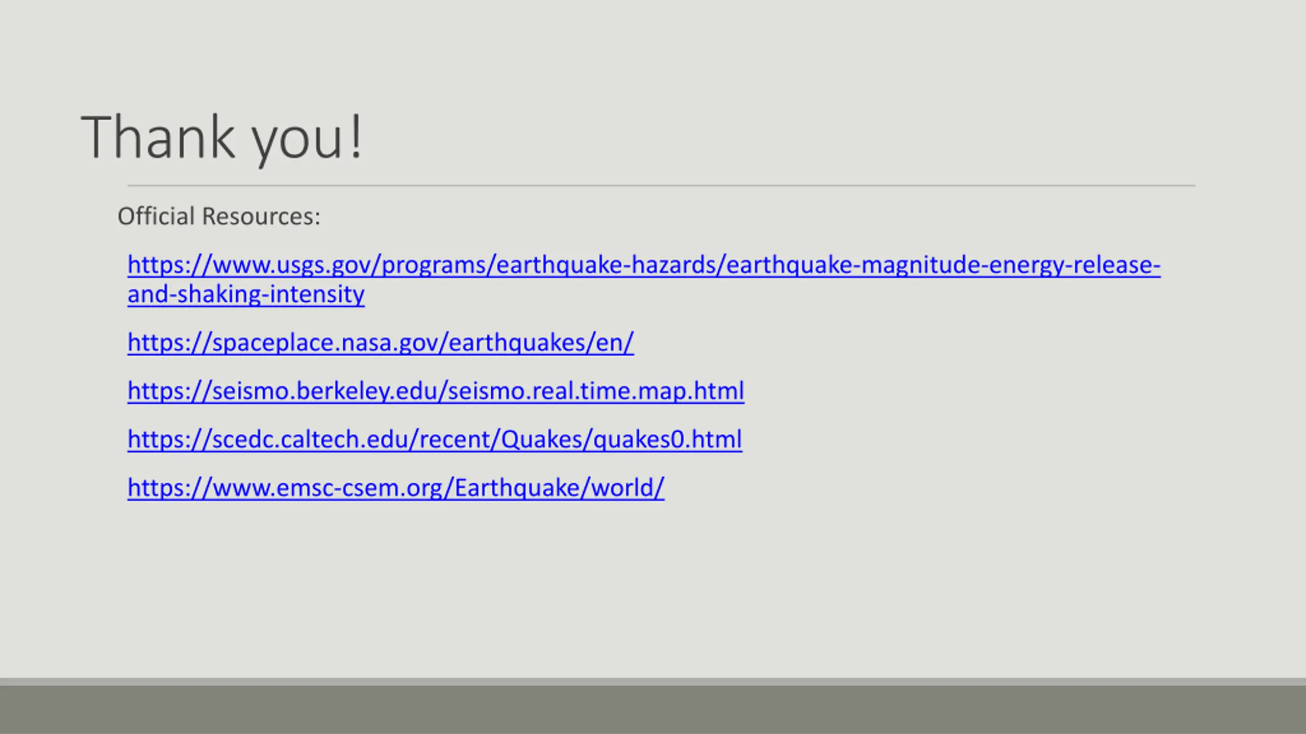 Thank you! Official Resources: https://www.usgs.gov/programs/earthquake-hazards/earthquake-magnitude-energy-release- and-shaking-intensity https://spaceplace.nasa.gov/earthquakes/en/ https://seismo.berkeley.edu/seismo.real.time.map.html https://scedc.caltech.edu/recent/Quakes/quakes0.html https://www.emsc-csem.org/Earthquake/world/