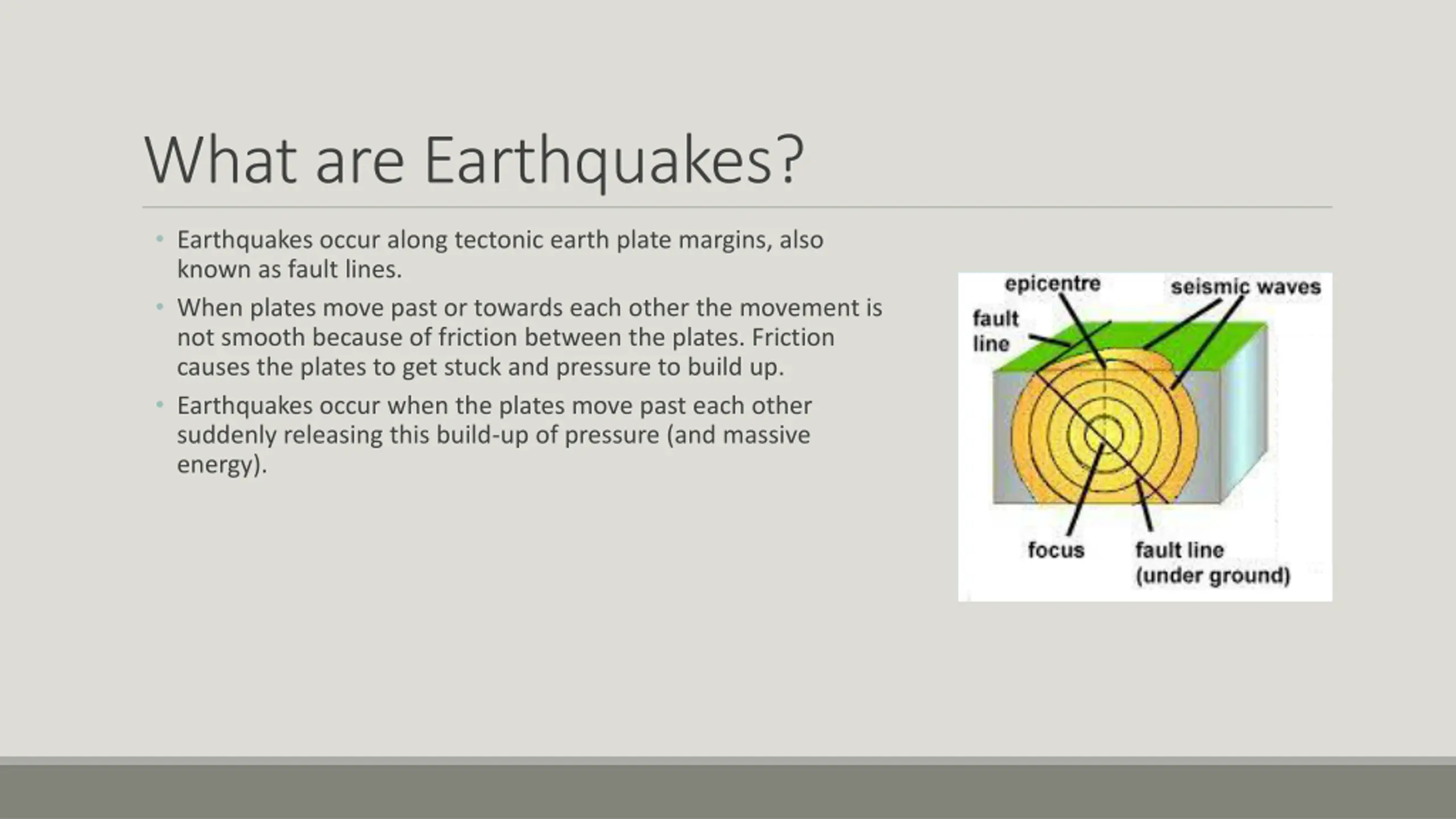 What are Earthquakes? Earthquakes occur along tectonic earth plate margins, also known as fault lines. When plates move past or towards each other the movement is not smooth because of friction between the plates. Friction causes the plates to get stuck and pressure to build up. Earthquakes occur when the plates move past each other suddenly releasing this build-up of pressure (and massive energy).