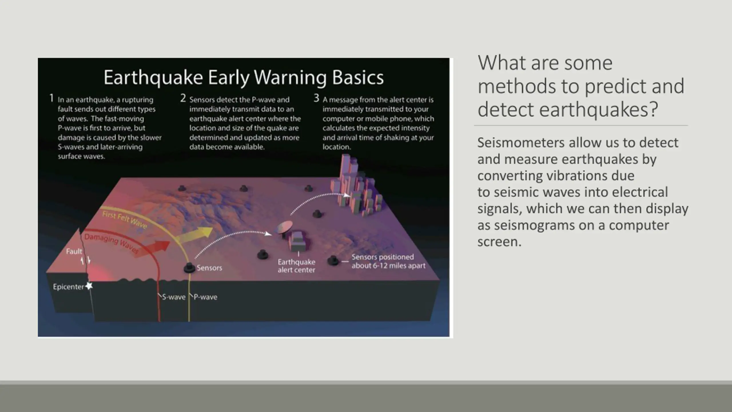 What are some methods to predict and detect earthquakes? Seismometers allow us to detect and measure earthquakes by converting vibrations due to seismic waves into electrical signals, which we can then display as seismograms on a computer screen.