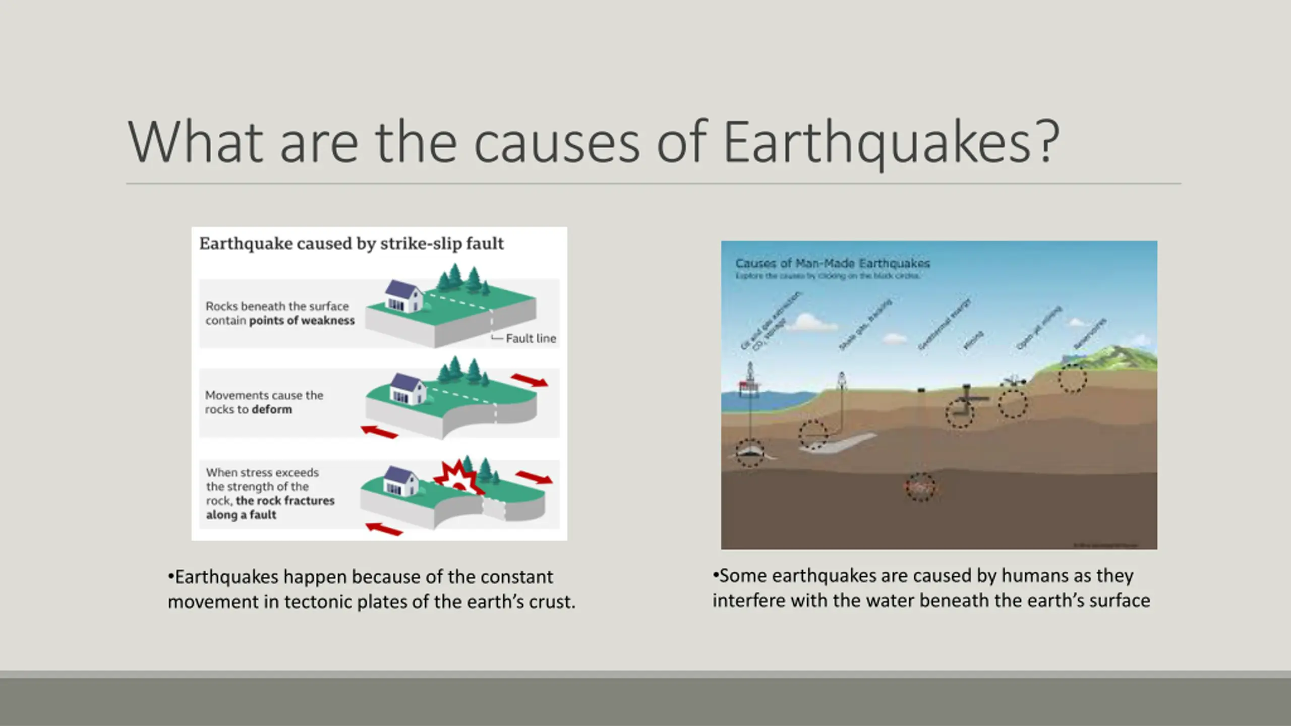 What are the causes of Earthquakes? Some earthquakes are caused by humans as they interfere with the water beneath the earth s surface Earthquakes happen because of the constant movement in tectonic plates of the earth s crust.