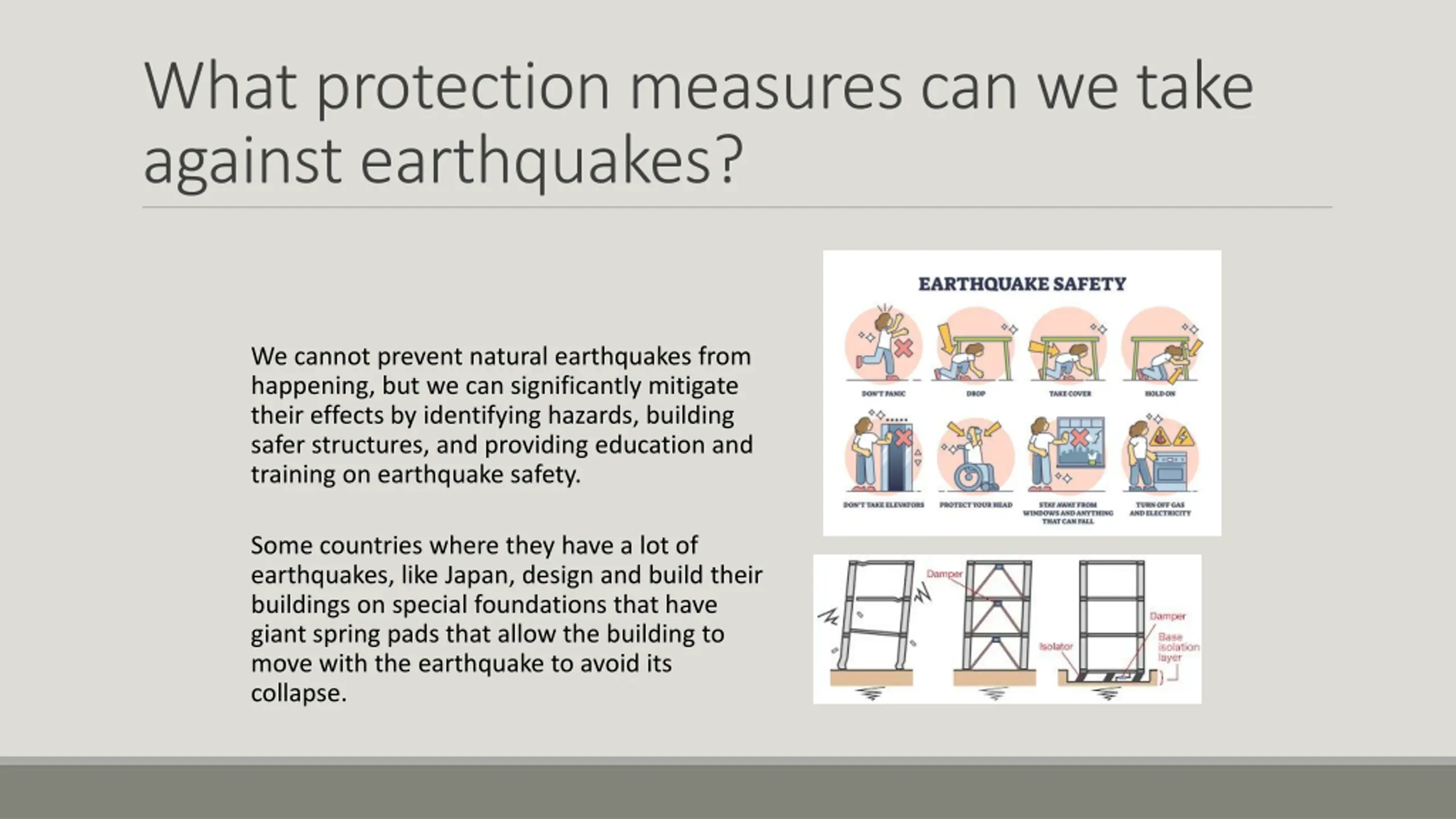 What protection measures can we take against earthquakes? We cannot prevent natural earthquakes from happening, but we can significantly mitigate their effects by identifying hazards, building safer structures, and providing education and training on earthquake safety. Some countries where they have a lot of earthquakes, like Japan, design and build their buildings on special foundations that have giant spring pads that allow the building to move with the earthquake to avoid its collapse.