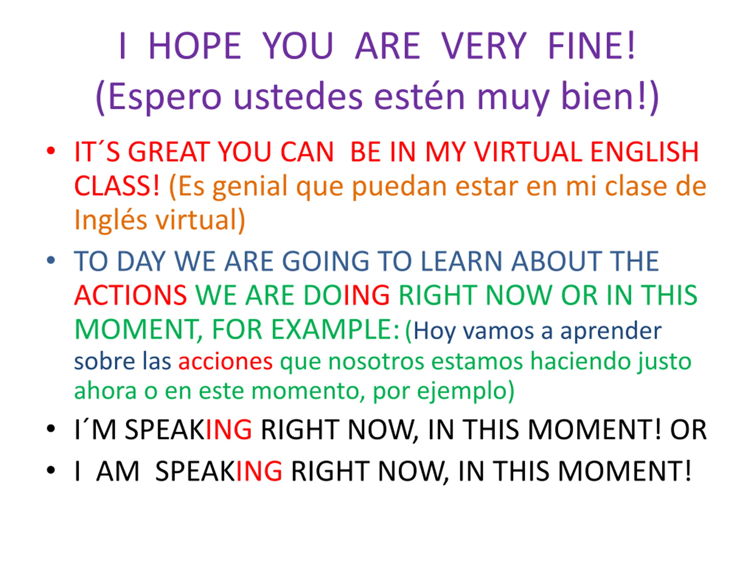 I HOPE YOU ARE VERY FINE! (Espero ustedes est n muy bien!) IT S GREAT YOU CAN BE IN MY VIRTUAL ENGLISH CLASS! (Es genial que puedan estar en mi clase de Ingl s virtual) TO DAY WE ARE GOING TO LEARN ABOUT THE ACTIONS WE ARE DOING RIGHT NOW OR IN THIS MOMENT, FOR EXAMPLE:(Hoy vamos a aprender sobre las acciones que nosotros estamos haciendo justo ahora o en este momento, por ejemplo) I M SPEAKING RIGHT NOW, IN THIS MOMENT! OR I AM SPEAKING RIGHT NOW, IN THIS MOMENT!