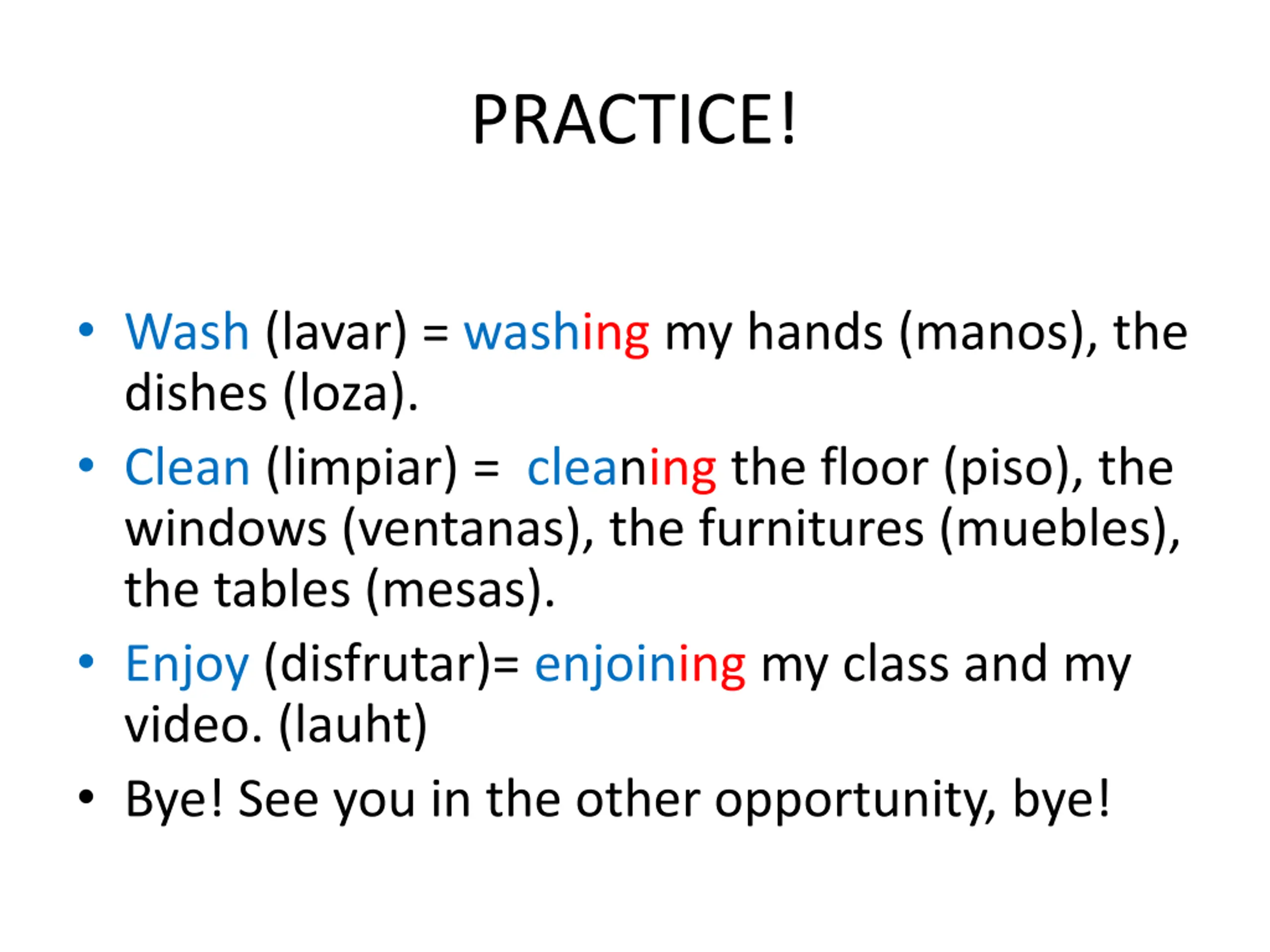 PRACTICE! Wash (lavar) = washing my hands (manos), the dishes (loza). Clean (limpiar) = cleaning the floor (piso), the windows (ventanas), the furnitures (muebles), the tables (mesas). Enjoy (disfrutar)= enjoining my class and my video. (lauht) Bye! See you in the other opportunity, bye!