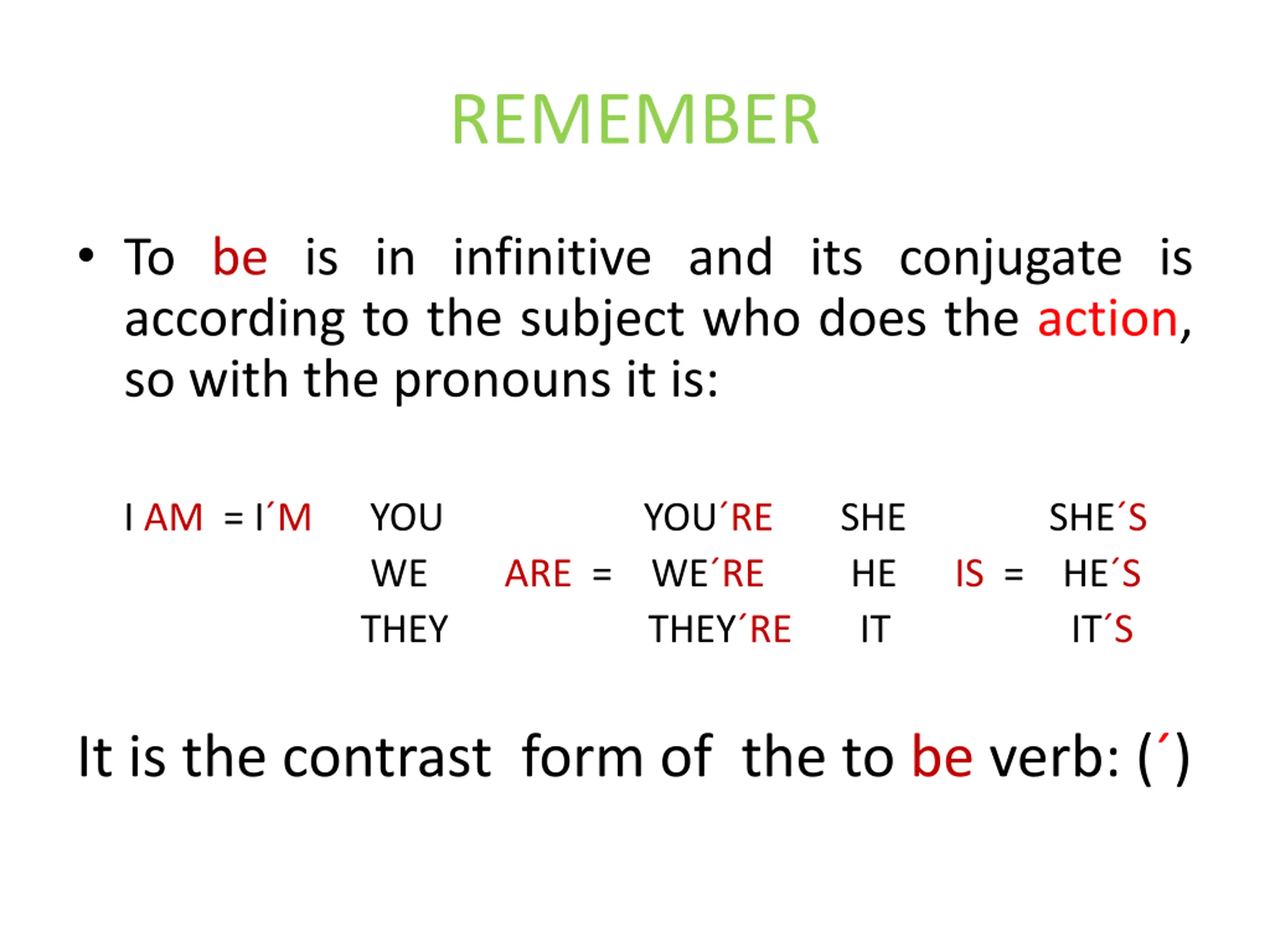 REMEMBER To be is in infinitive and its conjugate is according to the subject who does the action, so with the pronouns it is: I AM = I M YOU YOU RE WE ARE = WE RE THEY THEY RE SHE SHE S HE IS = HE S IT IT S It is the contrast form of the to be verb: ( )