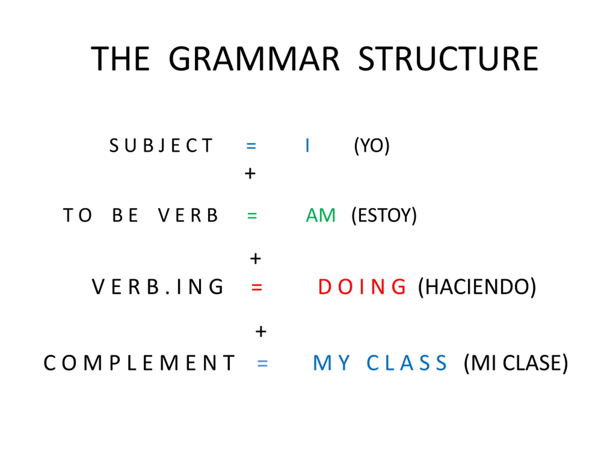 THE GRAMMAR STRUCTURE S U B J E C T = I (YO) + T O B E V E R B = AM (ESTOY) + V E R B . I N G = D O I N G (HACIENDO) + C O M P L E M E N T = M Y C L A S S (MI CLASE)