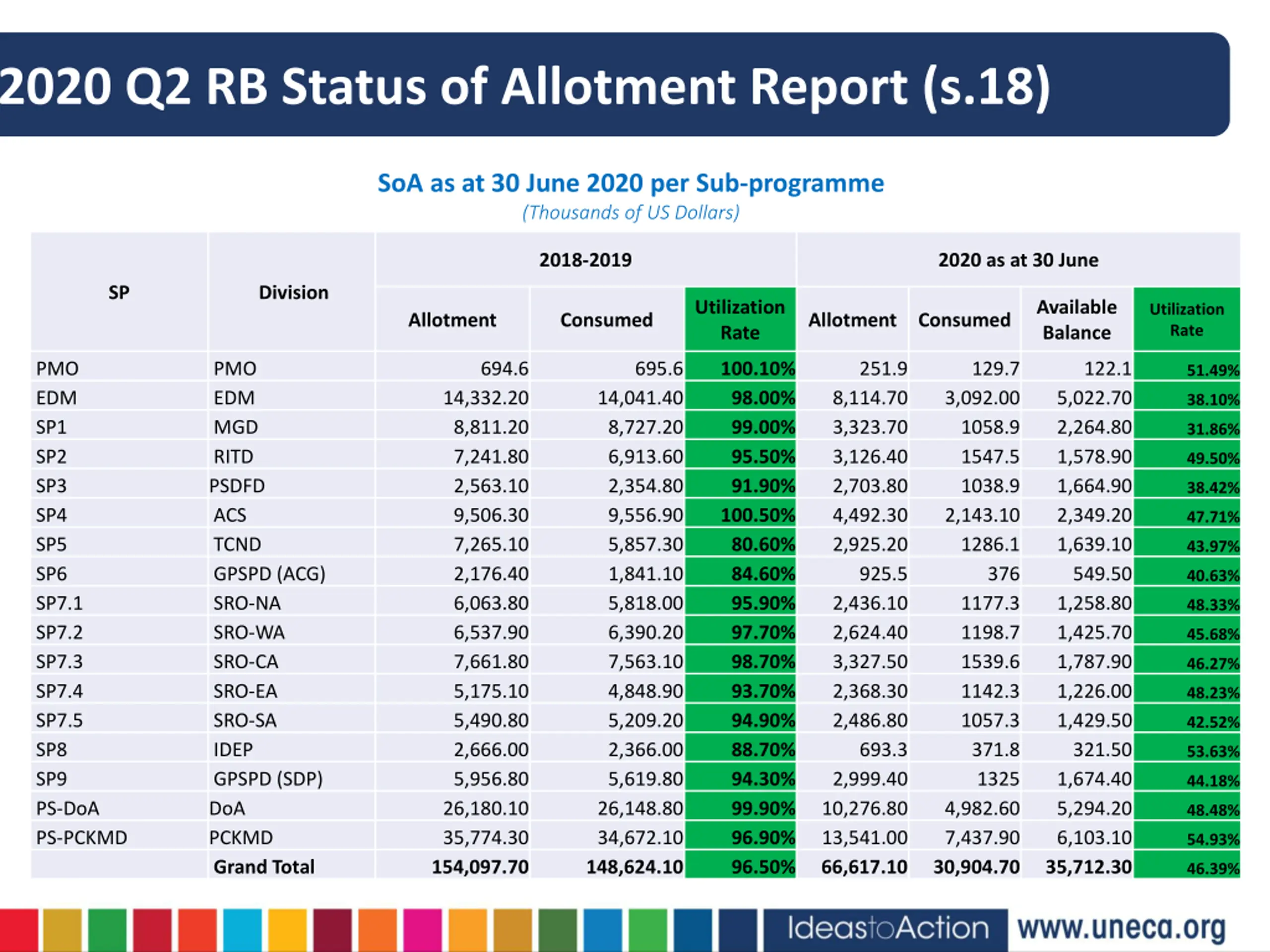 2020 Q2 RB Status of Allotment Report (s.18) SoA as at 30 June 2020 per Sub-programme (Thousands of US Dollars) 2018-2019 2020 as at 30 June SP Division Utilization Rate Available Balance Utilization Rate Allotment Consumed Allotment Consumed PMO EDM SP1 SP2 SP3 SP4 SP5 SP6 SP7.1 SP7.2 SP7.3 SP7.4 SP7.5 SP8 SP9 PS-DoA PS-PCKMD PMO EDM MGD RITD PSDFD ACS TCND GPSPD (ACG) SRO-NA SRO-WA SRO-CA SRO-EA SRO-SA IDEP GPSPD (SDP) DoA PCKMD Grand Total 694.6 695.6 100.10% 98.00% 99.00% 95.50% 91.90% 100.50% 80.60% 84.60% 95.90% 97.70% 98.70% 93.70% 94.90% 88.70% 94.30% 99.90% 96.90% 96.50% 251.9 129.7 122.1 51.49% 14,332.20 8,811.20 7,241.80 2,563.10 9,506.30 7,265.10 2,176.40 6,063.80 6,537.90 7,661.80 5,175.10 5,490.80 2,666.00 5,956.80 26,180.10 35,774.30 154,097.70 14,041.40 8,727.20 6,913.60 2,354.80 9,556.90 5,857.30 1,841.10 5,818.00 6,390.20 7,563.10 4,848.90 5,209.20 2,366.00 5,619.80 26,148.80 34,672.10 148,624.10 8,114.70 3,323.70 3,126.40 2,703.80 4,492.30 2,925.20 925.5 2,436.10 2,624.40 3,327.50 2,368.30 2,486.80 693.3 2,999.40 10,276.80 13,541.00 66,617.10 3,092.00 1058.9 1547.5 1038.9 2,143.10 1286.1 5,022.70 2,264.80 1,578.90 1,664.90 2,349.20 1,639.10 549.50 1,258.80 1,425.70 1,787.90 1,226.00 1,429.50 321.50 1,674.40 5,294.20 6,103.10 35,712.30 38.10% 31.86% 49.50% 38.42% 47.71% 43.97% 376 40.63% 1177.3 1198.7 1539.6 1142.3 1057.3 371.8 1325 4,982.60 7,437.90 30,904.70 48.33% 45.68% 46.27% 48.23% 42.52% 53.63% 44.18% 48.48% 54.93% 46.39%