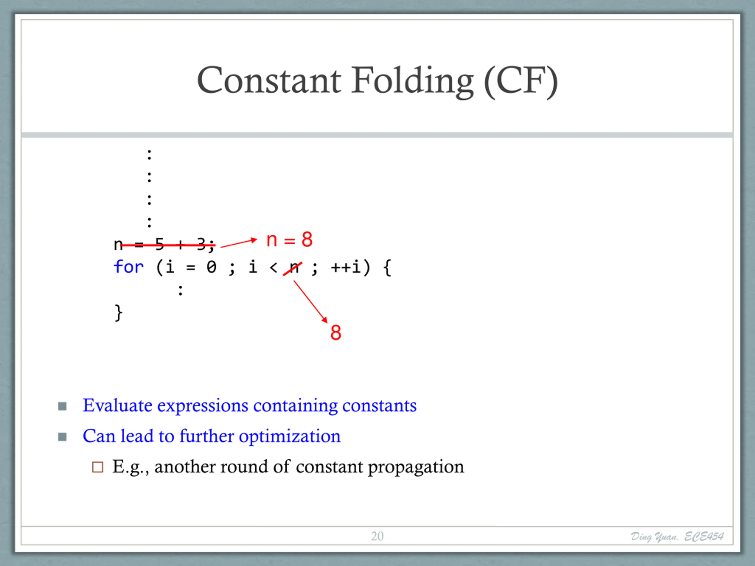 Constant Folding (CF) : : : : n = 5 + 3; for (i = 0 ; i < n ; ++i) { : } n = 8 8 Evaluate expressions containing constants Can lead to further optimization E.g., another round of constant propagation 20 Ding Yuan, ECE454