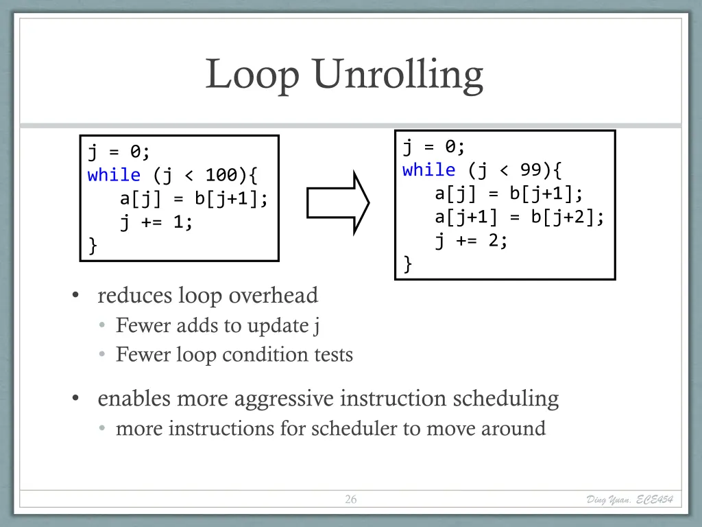 Loop Unrolling j = 0; while (j < 99){ a[j] = b[j+1]; a[j+1] = b[j+2]; j += 2; } j = 0; while (j < 100){ a[j] = b[j+1]; j += 1; } reduces loop overhead Fewer adds to update j Fewer loop condition tests enables more aggressive instruction scheduling more instructions for scheduler to move around 26 Ding Yuan, ECE454