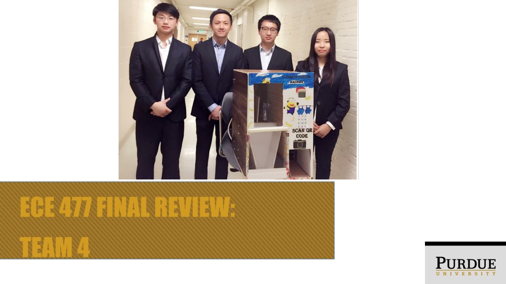 This project by Team 4 explores the implementation of an ultimate vending machine with a new payment system. The machine offers two methods for users to acquire items: via an Android app for ordering and paying, or by scanning generated QR codes. The team faced design challenges such as PCB design, transmission protocols, and software integration, with each member contributing expertise in hardware, system engineering, and software development to bring the project to life.