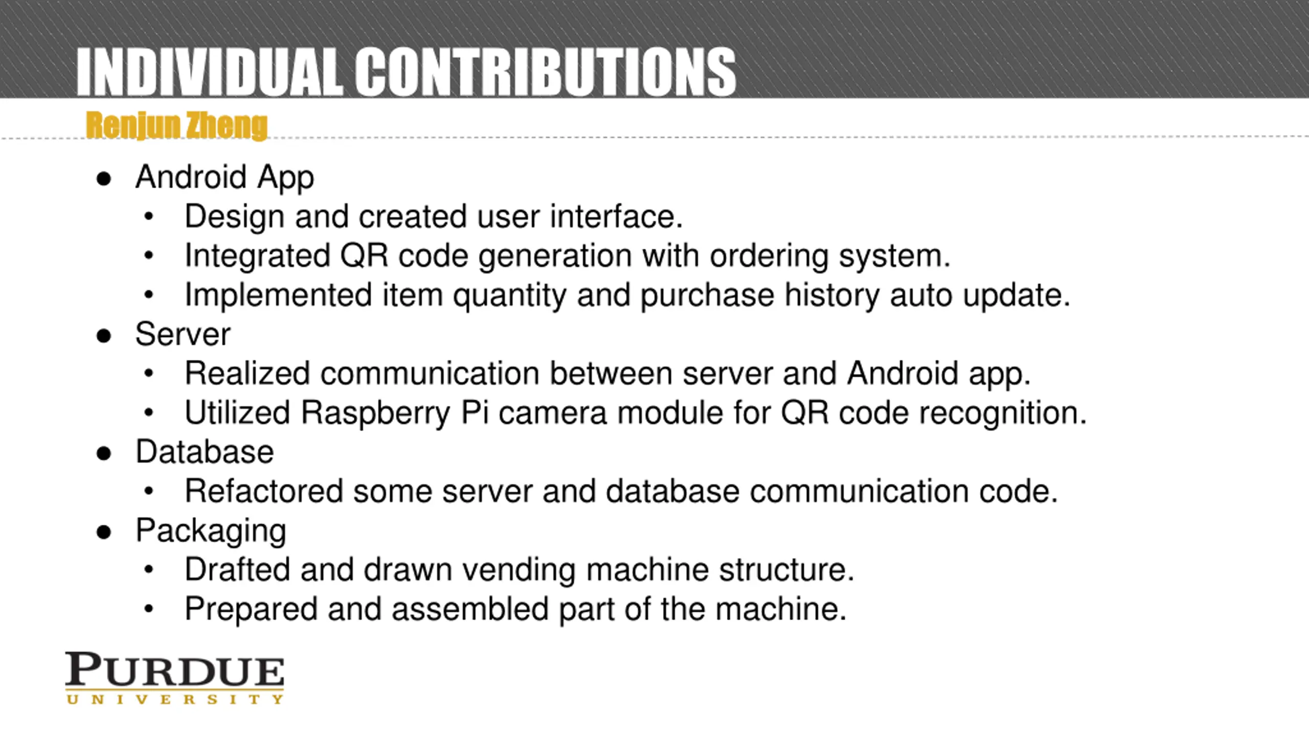 INDIVIDUAL CONTRIBUTIONS Renjun Zheng Renjun Zheng Android App Design and created user interface. Integrated QR code generation with ordering system. Implemented item quantity and purchase history auto update. Server Realized communication between server and Android app. Utilized Raspberry Pi camera module for QR code recognition. Database Refactored some server and database communication code. Packaging Drafted and drawn vending machine structure. Prepared and assembled part of the machine.