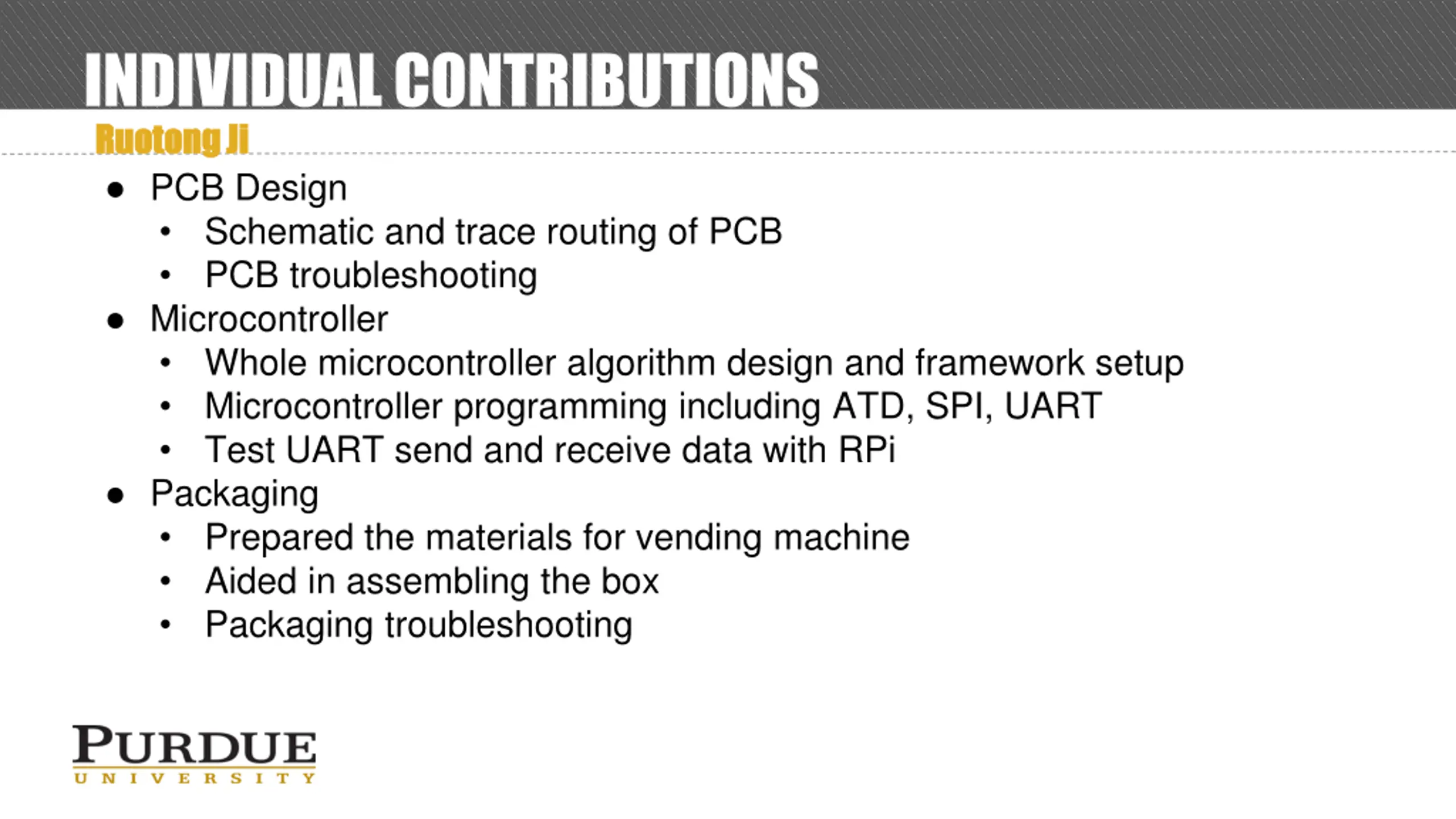 INDIVIDUAL CONTRIBUTIONS Ruotong Ji Ruotong Ji PCB Design Schematic and trace routing of PCB PCB troubleshooting Microcontroller Whole microcontroller algorithm design and framework setup Microcontroller programming including ATD, SPI, UART Test UART send and receive data with RPi Packaging Prepared the materials for vending machine Aided in assembling the box Packaging troubleshooting
