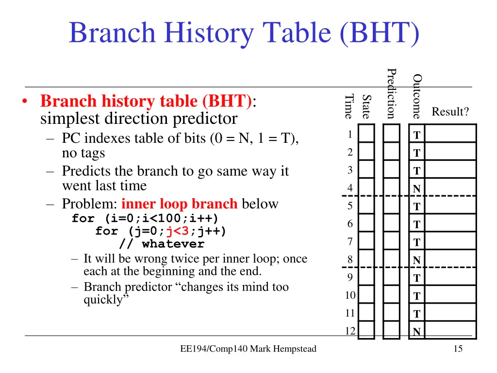 Branch Prediction Learn from past, predict the future Record the past in a hardware structure Direction predictor (DIRP) Map conditional-branch PC to taken/not-taken (T/N) decision Individual conditional branches often biased or weakly biased 90%+ one way or the other considered biased Why? Loop back edges, checking for uncommon conditions Branch history table (BHT): simplest predictor PC indexes table of bits (0 = Not taken, 1 = Taken), no tags Essentially: branch will go same way it went last time BHT Not shown: some way to update the BHT after a mis-predict PC [31:10] [9:2] 1:0 T or NT BHT idx What about aliasing? Two PC with the same lower bits? No problem, just a prediction! T or NT Prediction (taken or not taken) EE194/Comp140 Mark Hempstead 14