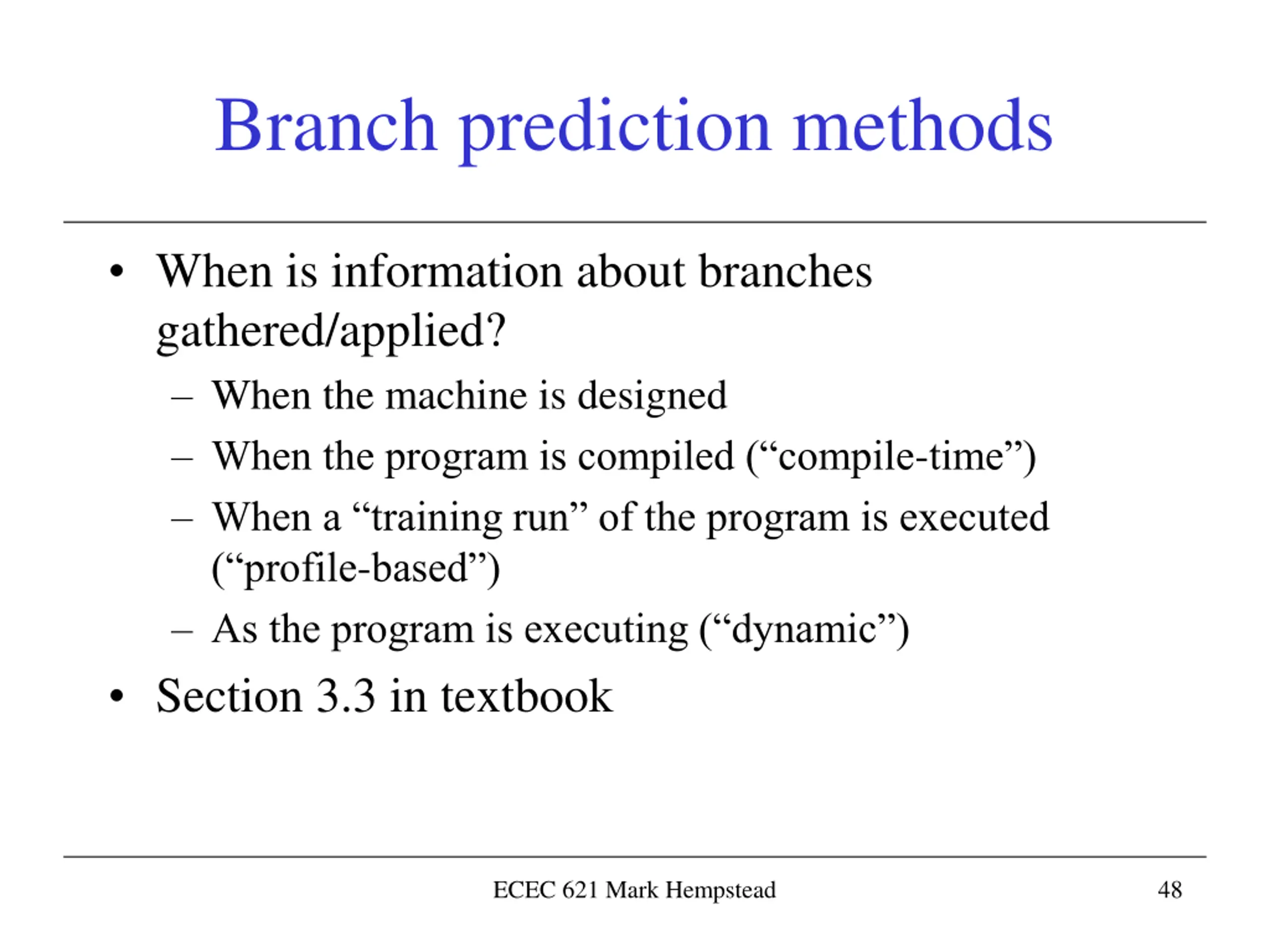 Branch prediction methods When is information about branches gathered/applied? When the machine is designed When the program is compiled ( compile-time ) When a training run of the program is executed ( profile-based ) As the program is executing ( dynamic ) Section 3.3 in textbook ECEC 621 Mark Hempstead 48