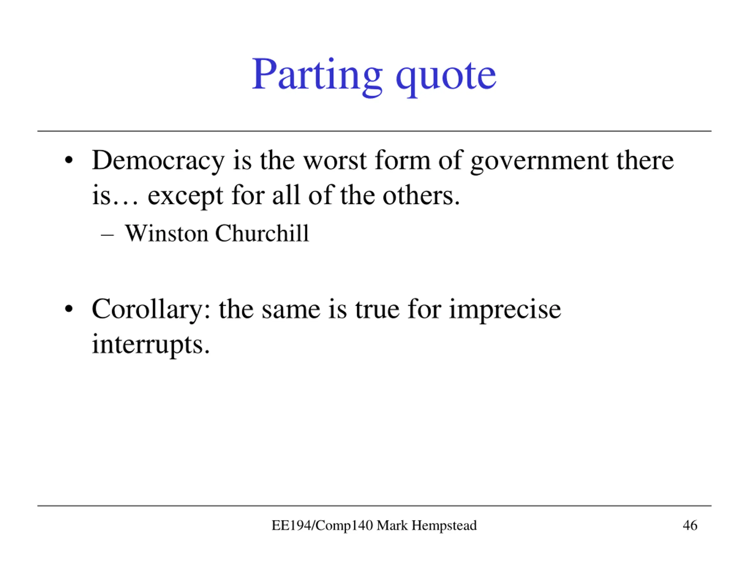Parting quote Democracy is the worst form of government there is except for all of the others. Winston Churchill Corollary: the same is true for imprecise interrupts. EE194/Comp140 Mark Hempstead 46