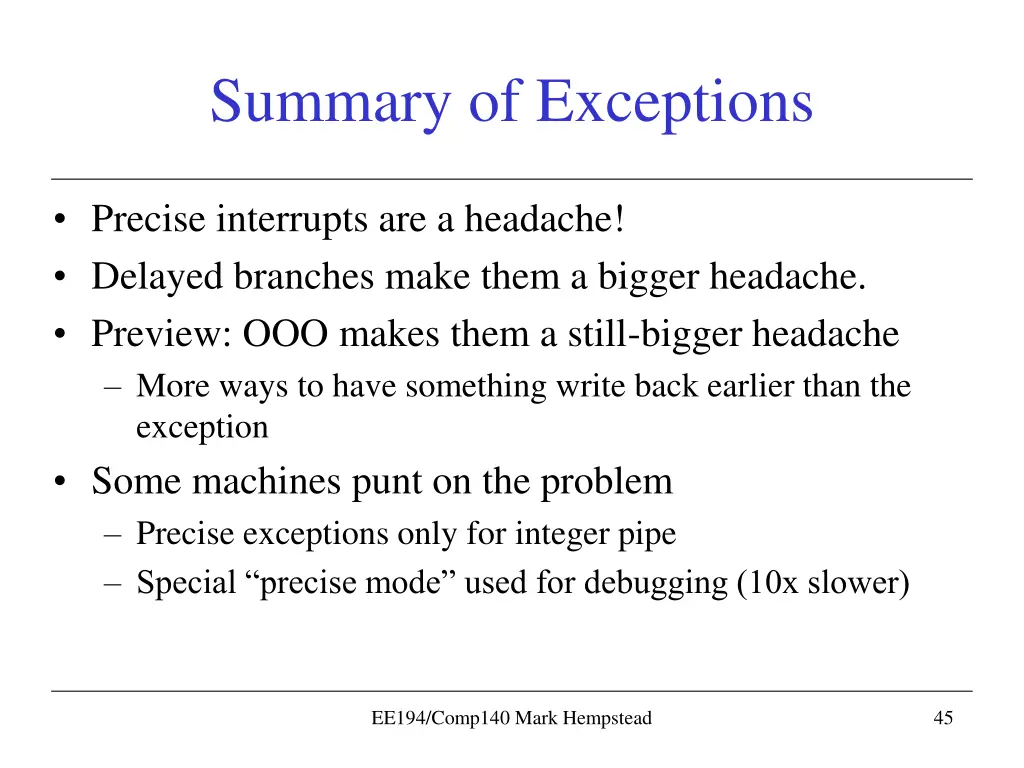 Branch-delay slots loop: stuff BEQ R2, R4, #loop LD R9, 30(R8) Consider the code The LD is a delay-slot instruction. MIPS always executes it after the branch, even if the branch is taken! What if LD faults after BEQ is taken? Must rerun it and then jump to loop But you re not re-executing the BEQ, so there s no reason to jump to loop. Suddenly restarting after interrupt is harder. EE194/Comp140 Mark Hempstead 44