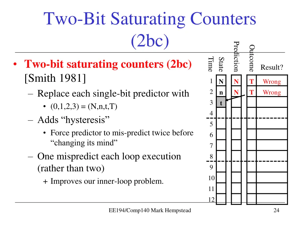 Two-bit Saturating Counters Taken Not Taken strongly taken weakly taken Predict Taken 11 Predict Taken 10 Taken Taken Not Taken strongly not taken weakly not taken Taken Predict Not Taken 00 Not Taken Predict Not Taken 01 Not Taken 2-bit FSMs mean prediction must miss twice before change N-bit predictors are possible, but after 2-bits not much benefit ECEC 621 Mark Hempstead 23