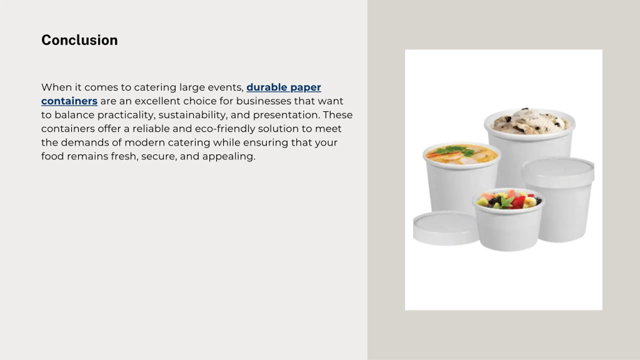 Conclusion When it comes to catering large events, durable paper containers are an excellent choice for businesses that want to balance practicality, sustainability, and presentation. These containers offer a reliable and eco-friendly solution to meet the demands of modern catering while ensuring that your food remains fresh, secure, and appealing.