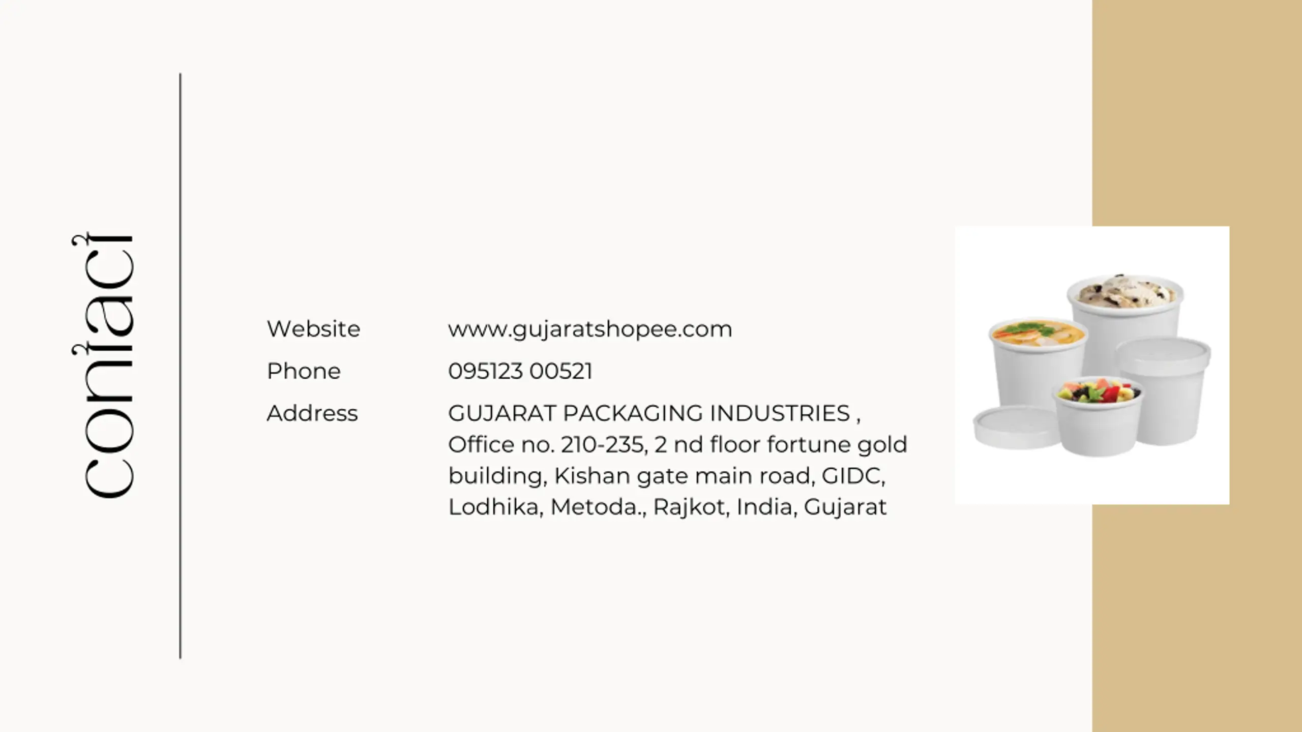 Why Choose Gujarat Shopee? At Gujarat Shopee, we are committed to providing catering businesses with the best packaging solutions. Our durable paper containers for catering large events are made from premium materials that ensure both strength and sustainability. Whether you re catering a large corporate gathering, wedding, or community event, our paper containers are designed to meet your specific needs. We offer a variety of sizes and designs, so you can find the perfect container for any dish. Plus, our products are designed with ease of use in mind, making your catering operations more efficient and less stressful. With a focus on high-quality, eco-friendly materials, Gujarat Shopee ensures that you are always equipped with the right packaging solution.