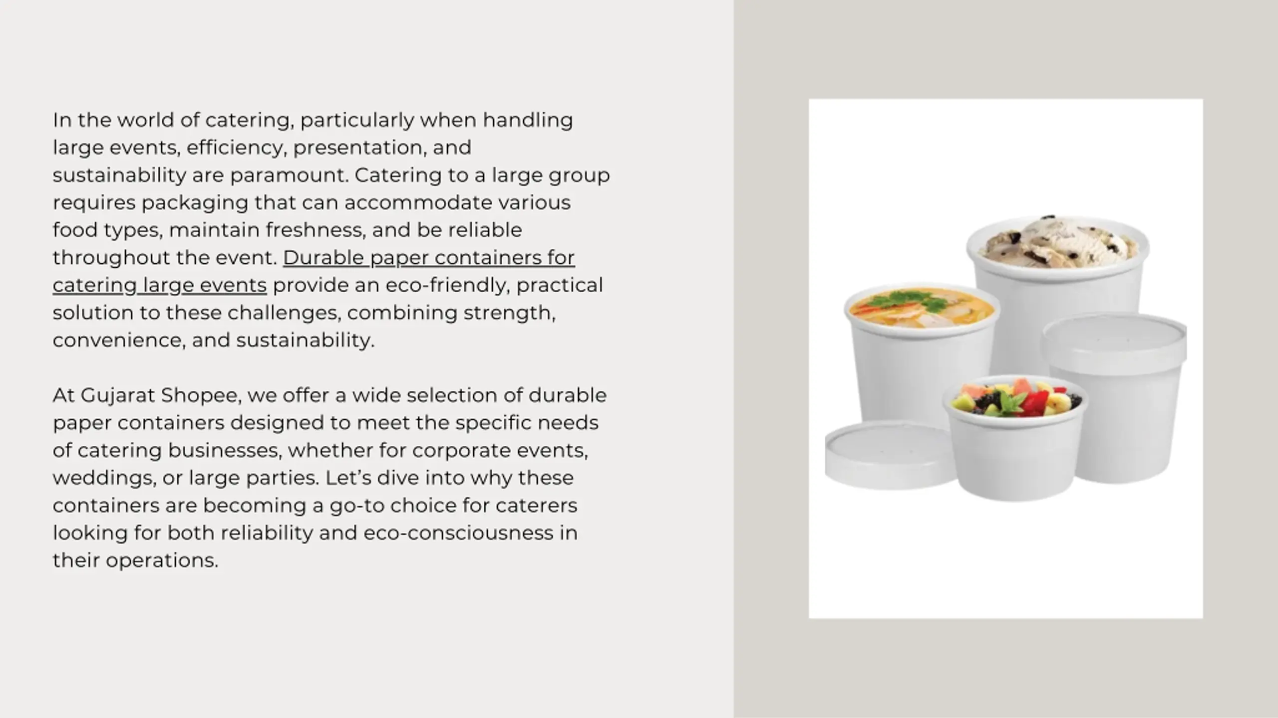 In the world of catering, particularly when handling large events, efficiency, presentation, and sustainability are paramount. Catering to a large group requires packaging that can accommodate various food types, maintain freshness, and be reliable throughout the event. Durable paper containers for catering large events provide an eco-friendly, practical solution to these challenges, combining strength, convenience, and sustainability. At Gujarat Shopee, we offer a wide selection of durable paper containers designed to meet the specific needs of catering businesses, whether for corporate events, weddings, or large parties. Let s dive into why these containers are becoming a go-to choice for caterers looking for both reliability and eco-consciousness in their operations.