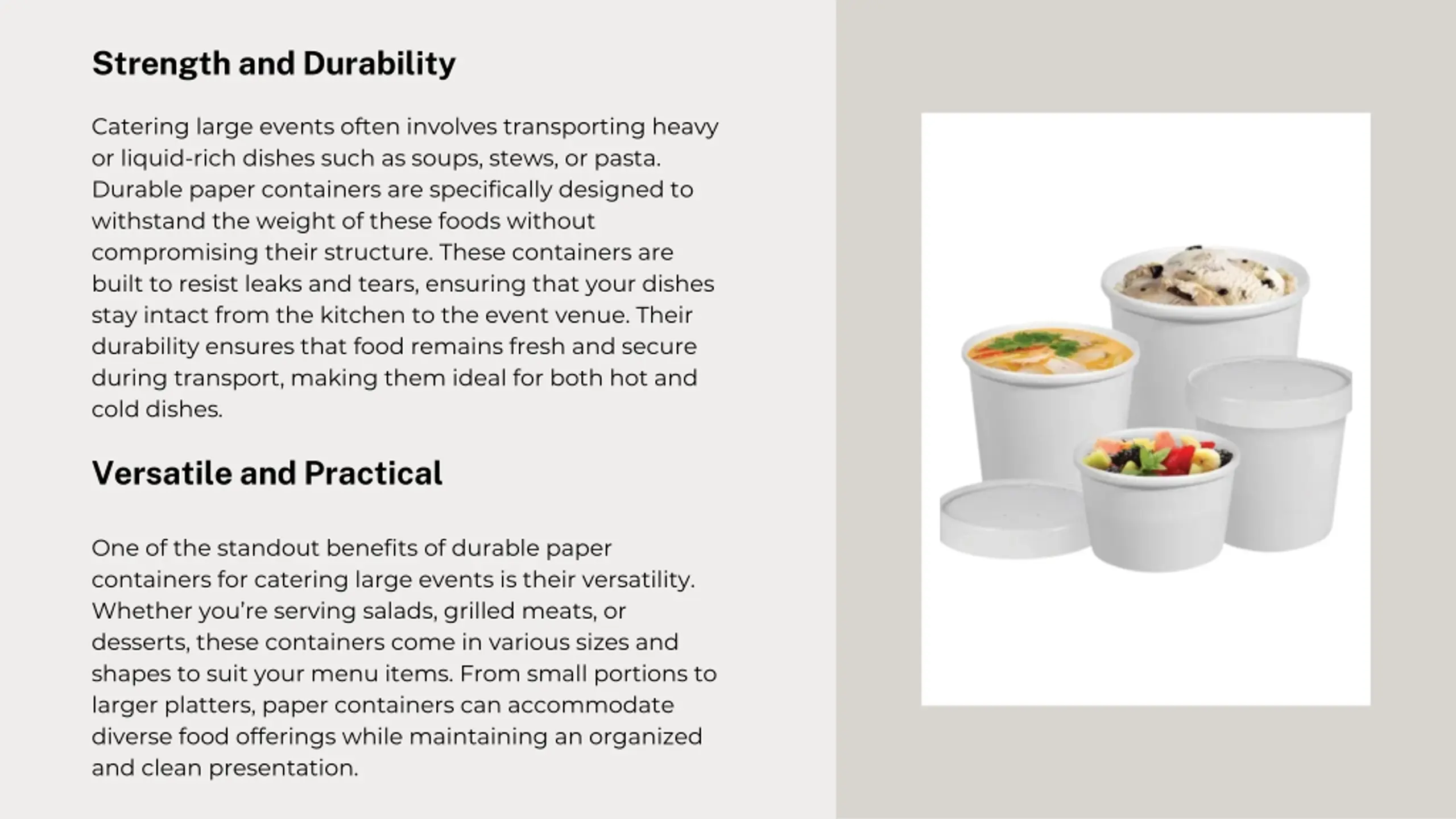Strength and Durability Catering large events often involves transporting heavy or liquid-rich dishes such as soups, stews, or pasta. Durable paper containers are specifically designed to withstand the weight of these foods without compromising their structure. These containers are built to resist leaks and tears, ensuring that your dishes stay intact from the kitchen to the event venue. Their durability ensures that food remains fresh and secure during transport, making them ideal for both hot and cold dishes. Versatile and Practical One of the standout benefits of durable paper containers for catering large events is their versatility. Whether you re serving salads, grilled meats, or desserts, these containers come in various sizes and shapes to suit your menu items. From small portions to larger platters, paper containers can accommodate diverse food offerings while maintaining an organized and clean presentation.