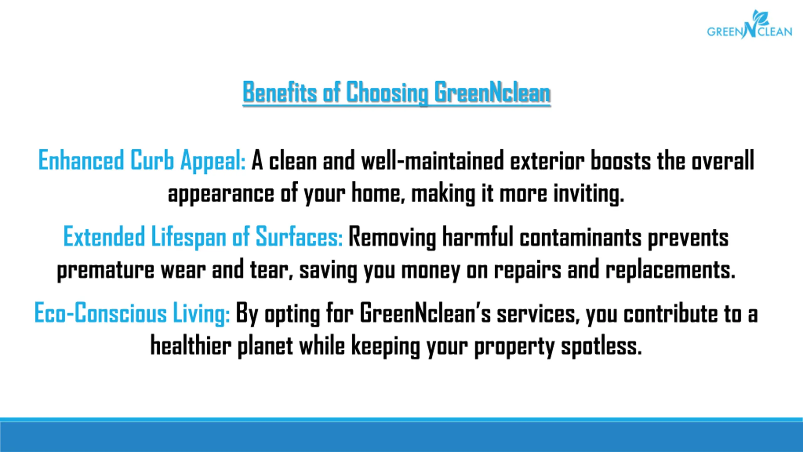 Benefits of Choosing GreenNclean Enhanced Curb Appeal: A clean and well-maintained exterior boosts the overall appearance of your home, making it more inviting. Extended Lifespan of Surfaces: Removing harmful contaminants prevents premature wear and tear, saving you money on repairs and replacements. Eco-Conscious Living: By opting for GreenNclean s services, you contribute to a healthier planet while keeping your property spotless.