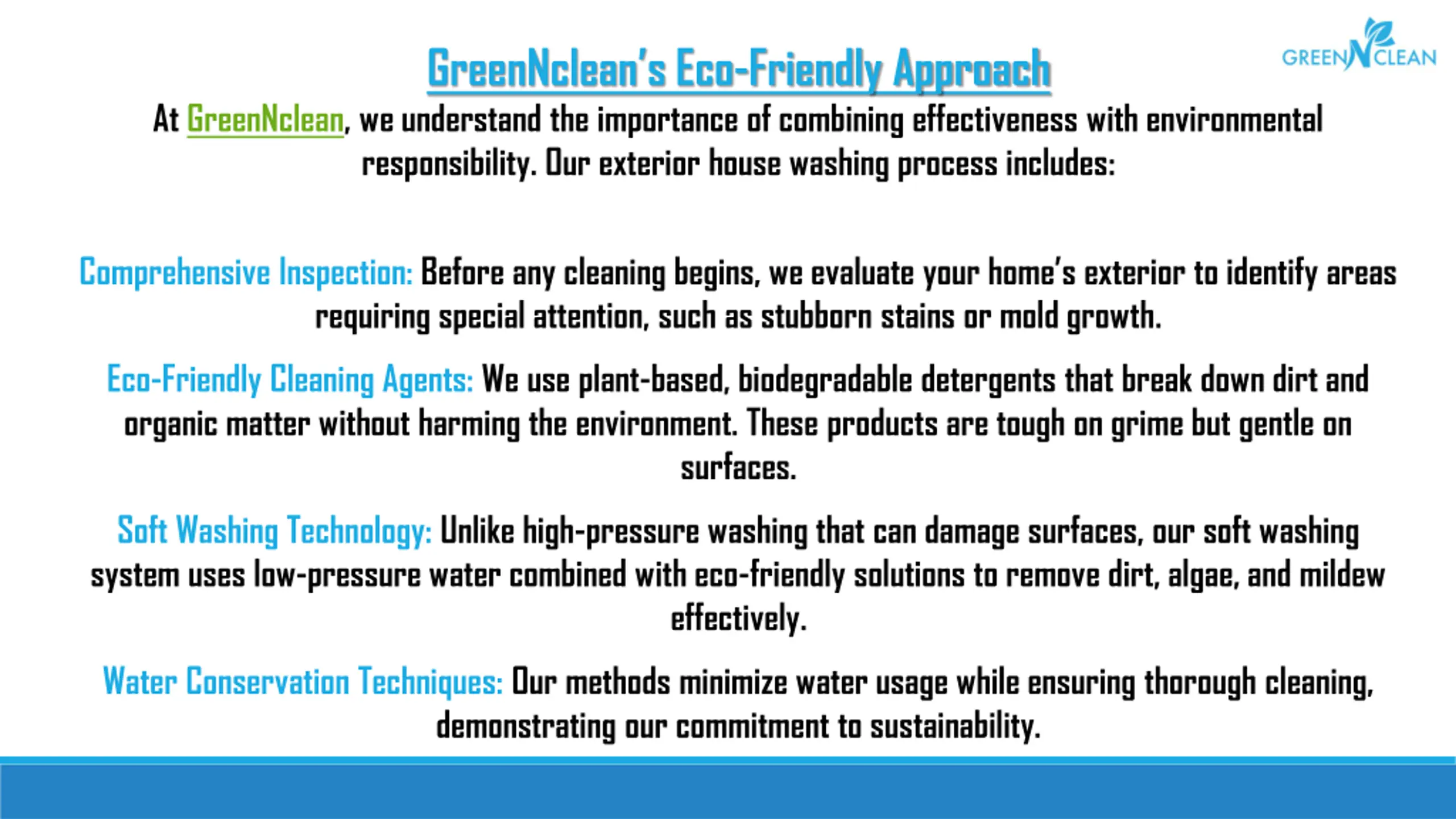 GreenNcleans Eco-Friendly Approach At GreenNclean, we understand the importance of combining effectiveness with environmental responsibility. Our exterior house washing process includes: Comprehensive Inspection: Before any cleaning begins, we evaluate your home s exterior to identify areas requiring special attention, such as stubborn stains or mold growth. Eco-Friendly Cleaning Agents: We use plant-based, biodegradable detergents that break down dirt and organic matter without harming the environment. These products are tough on grime but gentle on surfaces. Soft Washing Technology: Unlike high-pressure washing that can damage surfaces, our soft washing system uses low-pressure water combined with eco-friendly solutions to remove dirt, algae, and mildew effectively. Water Conservation Techniques: Our methods minimize water usage while ensuring thorough cleaning, demonstrating our commitment to sustainability.
