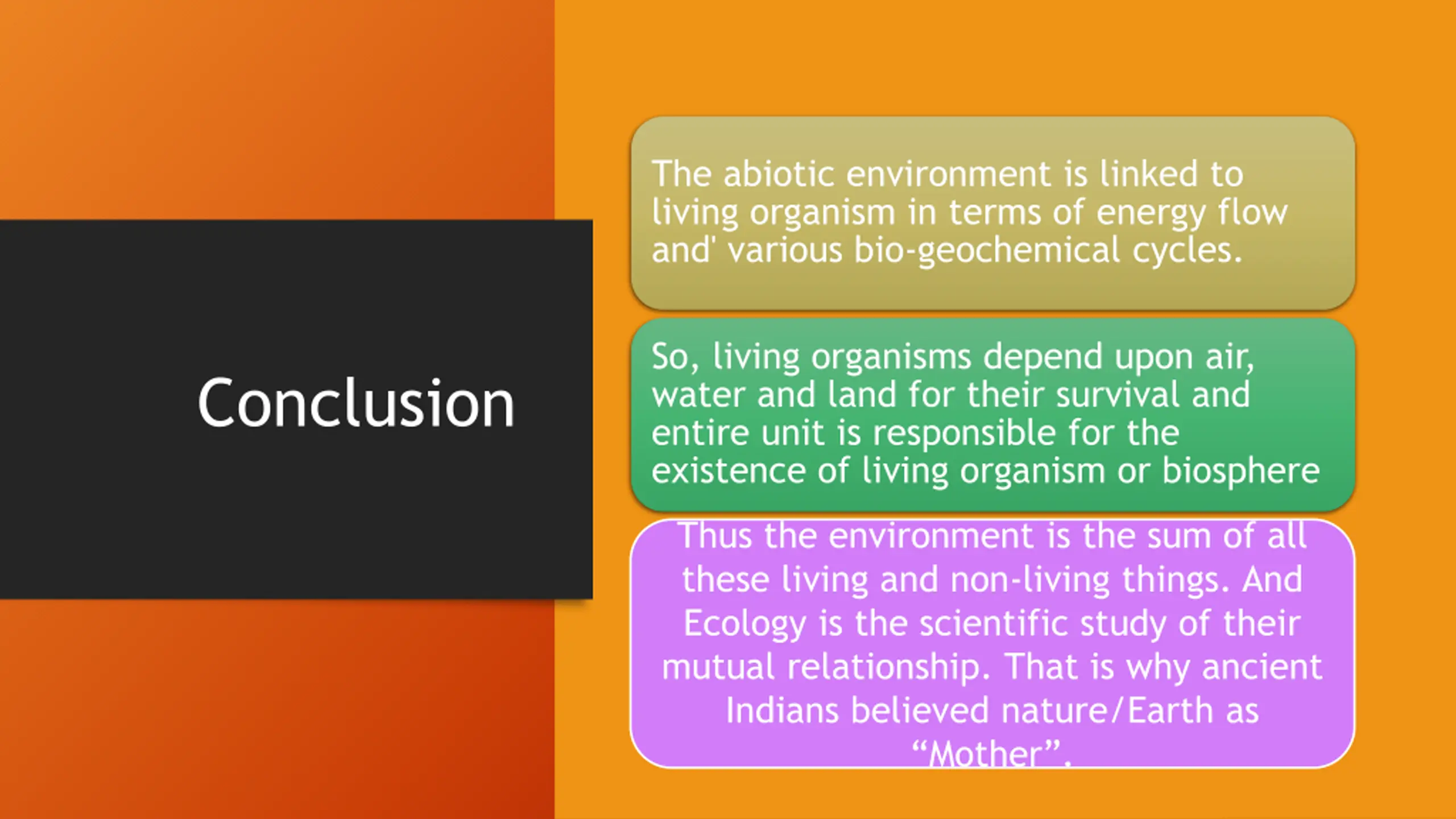 The abiotic environment is linked to living organism in terms of energy flow and' various bio-geochemical cycles. So, living organisms depend upon air, water and land for their survival and entire unit is responsible for the existence of living organism or biosphere Conclusion Thus the environment is the sum of all these living and non-living things. And Ecology is the scientific study of their mutual relationship. That is why ancient Indians believed nature/Earth as Mother .