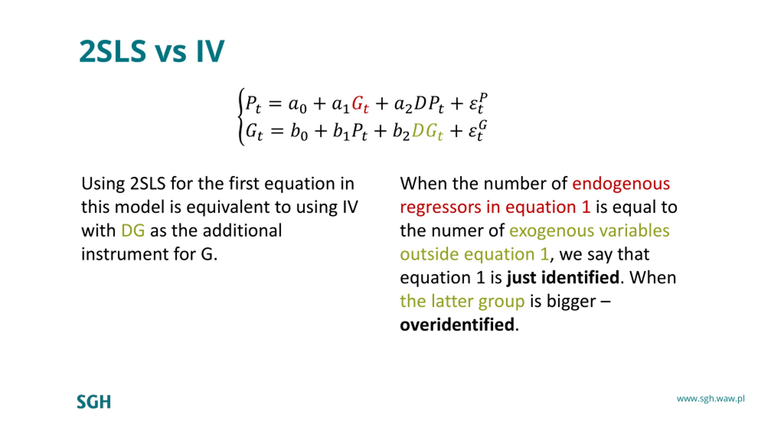 2SLS vs IV ??= ?0+ ?1??+ ?2???+ ??? ??= ?0+ ?1??+ ?2???+ ??? Using 2SLS for the first equation in this model is equivalent to using IV with DG as the additional instrument for G. When the number of endogenous regressors in equation 1 is equal to the numer of exogenous variables outside equation 1, we say that equation 1 is just identified. When the latter group is bigger overidentified. www.sgh.waw.pl