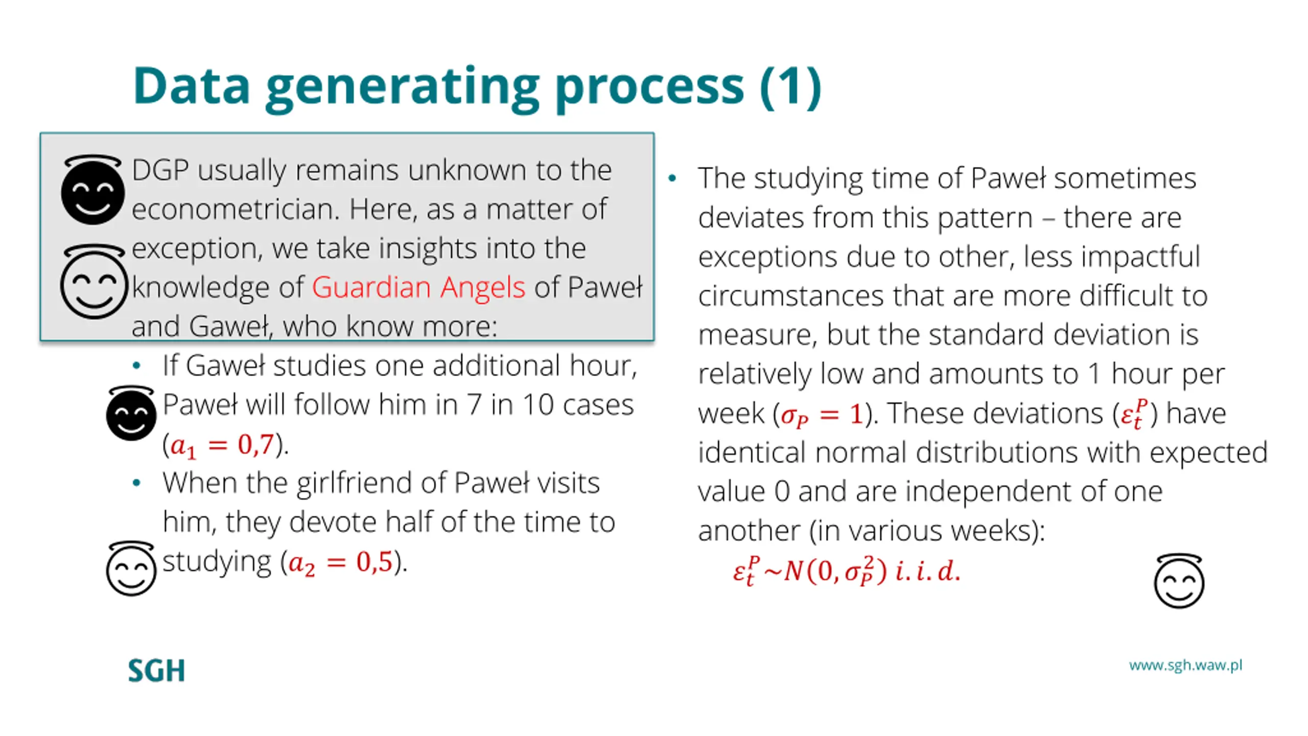 Data generating process (1) DGP usually remains unknown to the econometrician. Here, as a matter of exception, we take insights into the knowledge of Guardian Angels of Pawe and Gawe , who know more: If Gawe studies one additional hour, Pawe will follow him in 7 in 10 cases (?1= 0,7). When the girlfriend of Pawe visits him, they devote half of the time to studying (?2= 0,5). The studying time of Pawe sometimes deviates from this pattern there are exceptions due to other, less impactful circumstances that are more difficult to measure, but the standard deviation is relatively low and amounts to 1 hour per week (??= 1). These deviations (???) have identical normal distributions with expected value 0 and are independent of one another (in various weeks): ???~? 0,?? 2 ?.?.?. www.sgh.waw.pl