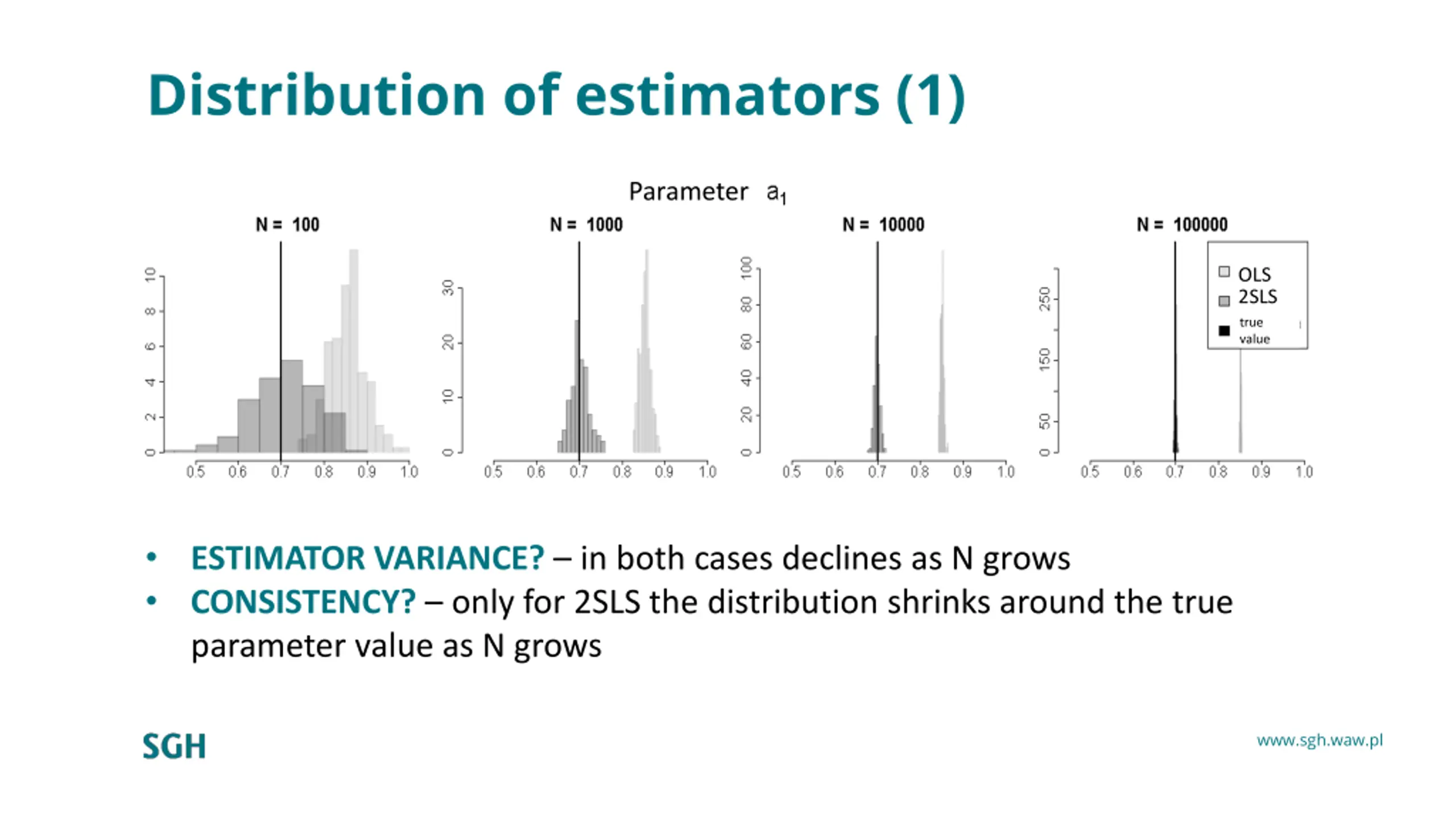 Distribution of estimators (1) Parameter OLS 2SLS true value ESTIMATOR VARIANCE? in both cases declines as N grows CONSISTENCY? only for 2SLS the distribution shrinks around the true parameter value as N grows www.sgh.waw.pl