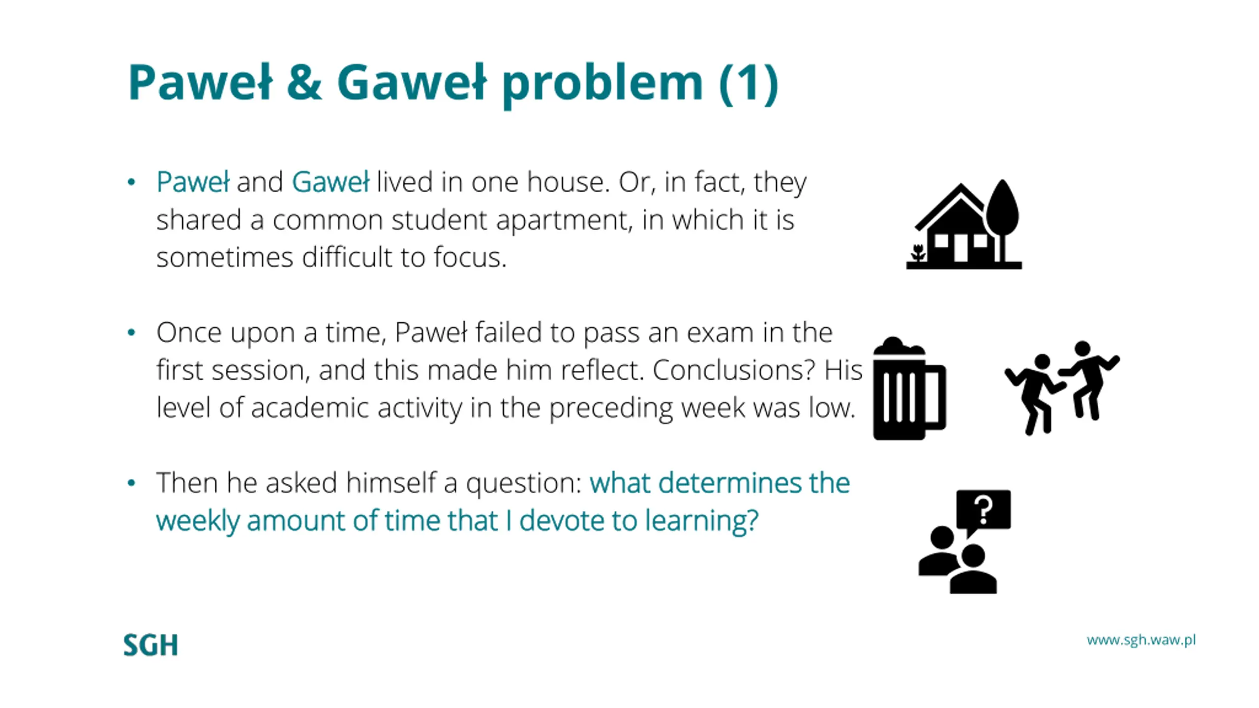 Pawe & Gawe problem (1) Pawe Pawe and Gawe shared a common student apartment, in which it is sometimes difficult to focus. Gawe lived in one house. Or, in fact, they Once upon a time, Pawe failed to pass an exam in the first session, and this made him reflect. Conclusions? His level of academic activity in the preceding week was low. Then he asked himself a question: what weekly weekly amount amount of of time time that what determines determines the devote to learning? to learning? the that I I devote www.sgh.waw.pl