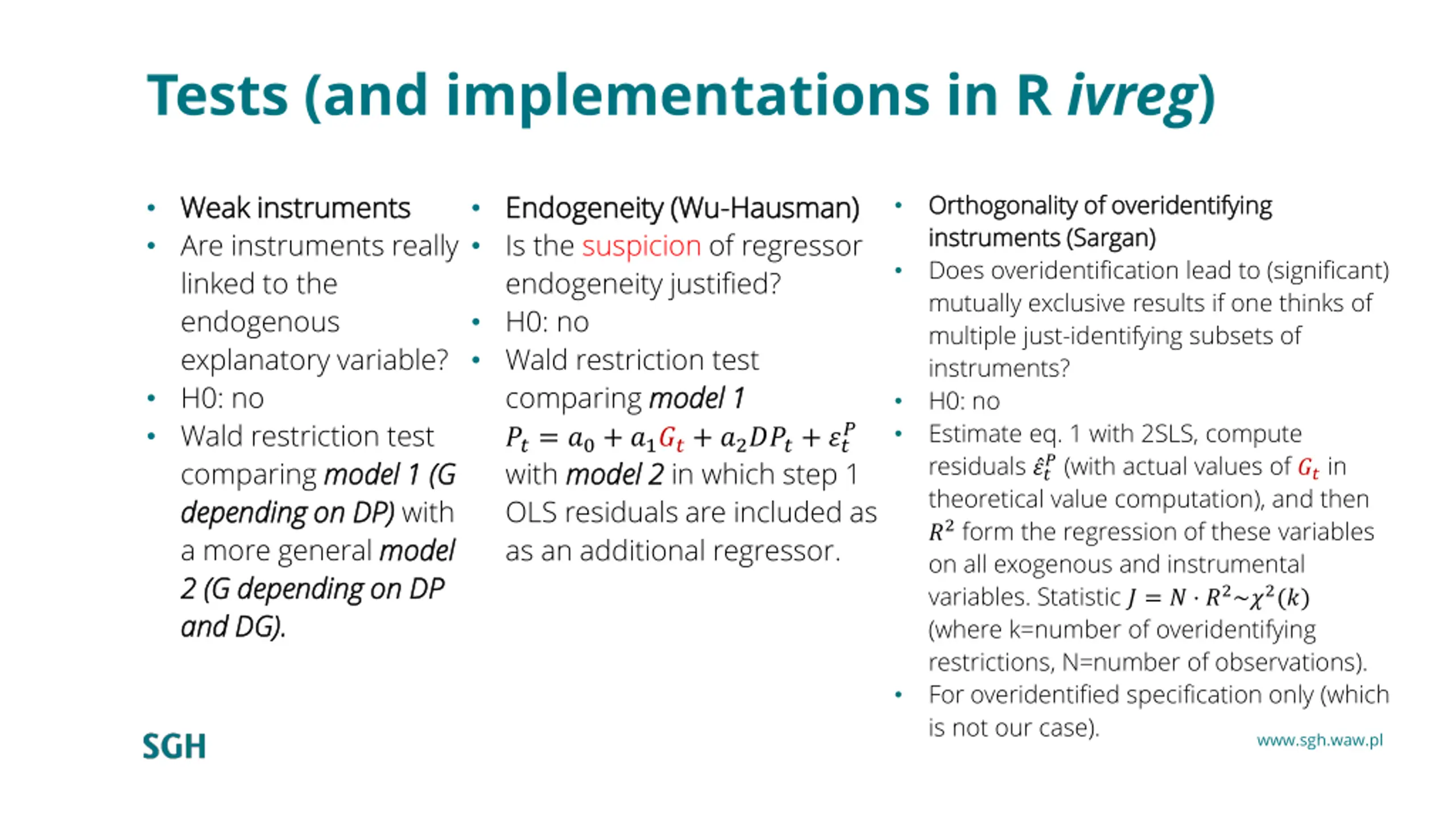 Tests (and implementations in R ivreg) Weak Weak instruments instruments Are instruments really linked to the endogenous explanatory variable? H0: no Wald restriction test comparing model 1 (G depending depending on DP) a more general model 2 (G 2 (G depending depending on DP and DG). and DG). Endogeneity Endogeneity (Wu Is the suspicion of regressor endogeneity justified? H0: no Wald restriction test comparing model 1 model 1 ??= ?0+ ?1??+ ?2???+ ??? with model 2 model 2 in which step 1 OLS residuals are included as as an additional regressor. (Wu- -Hausman) Hausman) Orthogonality Orthogonality of instruments instruments ( (Sargan Does overidentification lead to (significant) mutually exclusive results if one thinks of multiple just-identifying subsets of instruments? H0: no Estimate eq. 1 with 2SLS, compute residuals ??? (with actual values of ?? in theoretical value computation), and then ?2 form the regression of these variables on all exogenous and instrumental variables. Statistic ? = ? ?2~?2(?) (where k=number of overidentifying restrictions, N=number of observations). For overidentified specification only (which is not our case). of overidentifying overidentifying Sargan) ) model 1 (G on DP) with model on DP www.sgh.waw.pl