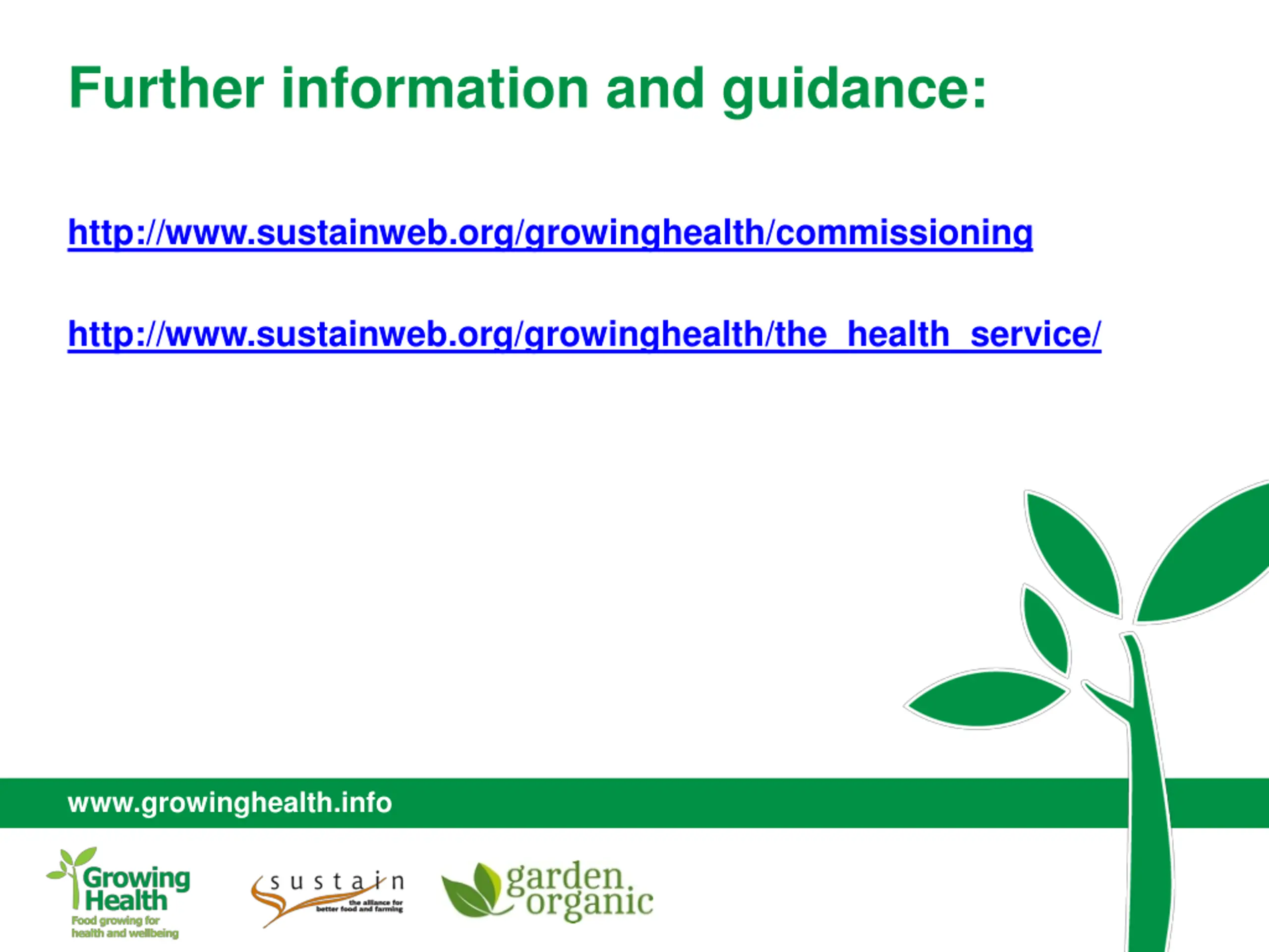 Further information and guidance: http://www.sustainweb.org/growinghealth/commissioning http://www.sustainweb.org/growinghealth/the_health_service/ www.growinghealth.info