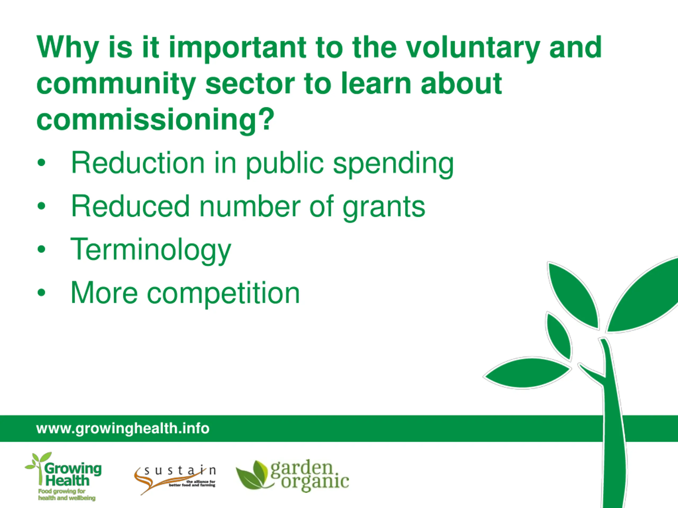 Why is it important to the voluntary and community sector to learn about commissioning? Reduction in public spending Reduced number of grants Terminology More competition www.growinghealth.info