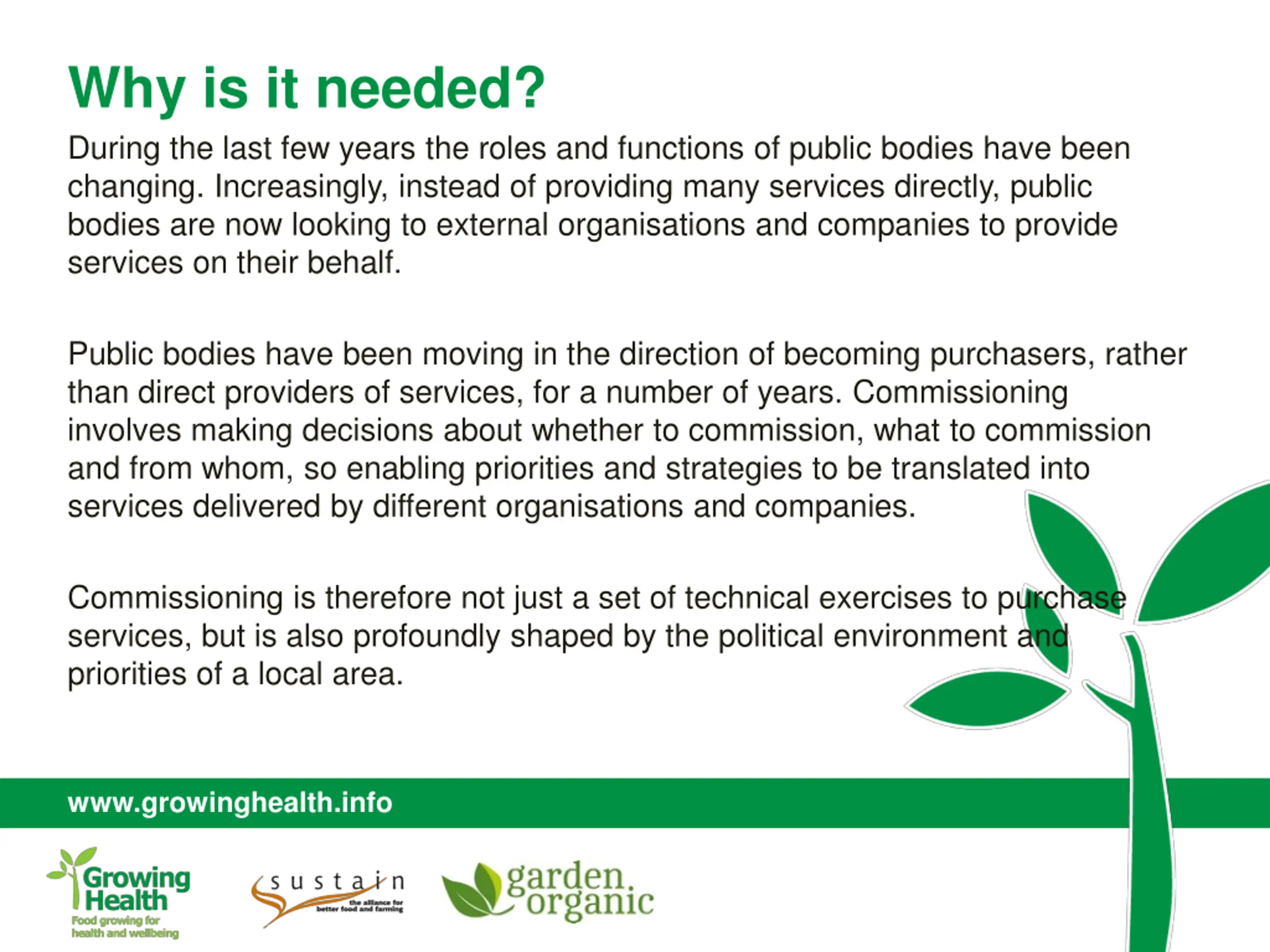 Why is it needed? During the last few years the roles and functions of public bodies have been changing. Increasingly, instead of providing many services directly, public bodies are now looking to external organisations and companies to provide services on their behalf. Public bodies have been moving in the direction of becoming purchasers, rather than direct providers of services, for a number of years. Commissioning involves making decisions about whether to commission, what to commission and from whom, so enabling priorities and strategies to be translated into services delivered by different organisations and companies. Commissioning is therefore not just a set of technical exercises to purchase services, but is also profoundly shaped by the political environment and priorities of a local area. www.growinghealth.info