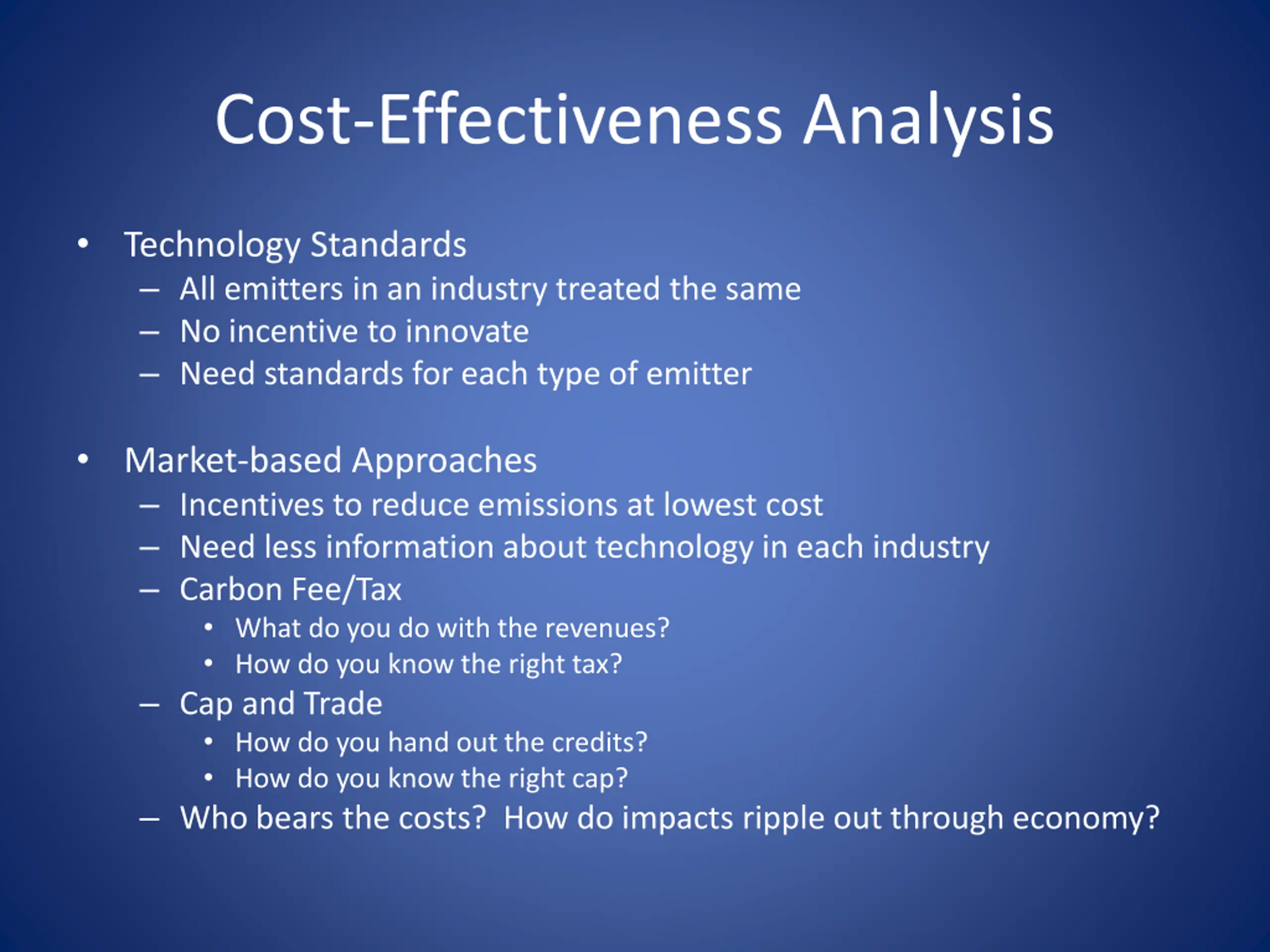 Cost-Effectiveness Analysis Technology Standards All emitters in an industry treated the same No incentive to innovate Need standards for each type of emitter Market-based Approaches Incentives to reduce emissions at lowest cost Need less information about technology in each industry Carbon Fee/Tax What do you do with the revenues? How do you know the right tax? Cap and Trade How do you hand out the credits? How do you know the right cap? Who bears the costs? How do impacts ripple out through economy?