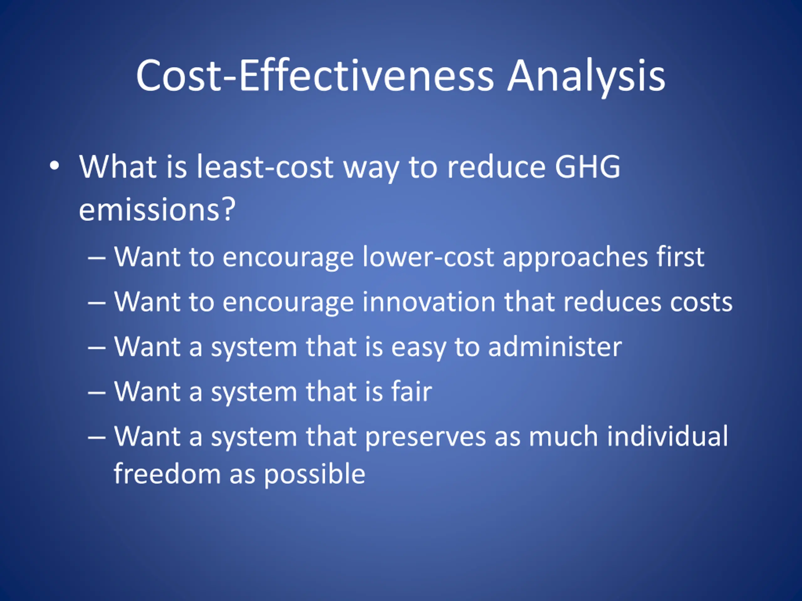 Cost-Effectiveness Analysis What is least-cost way to reduce GHG emissions? Want to encourage lower-cost approaches first Want to encourage innovation that reduces costs Want a system that is easy to administer Want a system that is fair Want a system that preserves as much individual freedom as possible